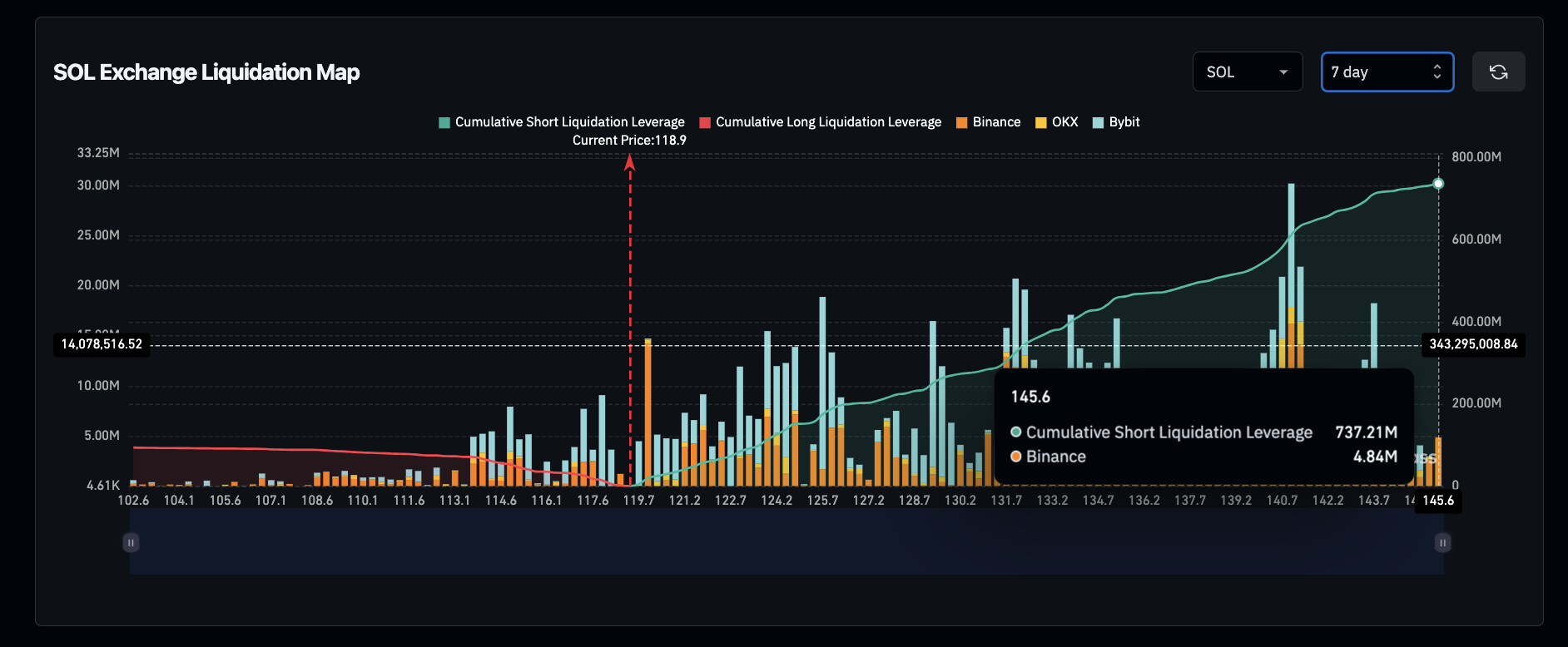 Los datos de liquidación de Coinglass rastrean el apalancamiento total desplegado en los contratos de futuros perpetuos de SOL activos, revelando un interés corto significativo en niveles de precios clave.