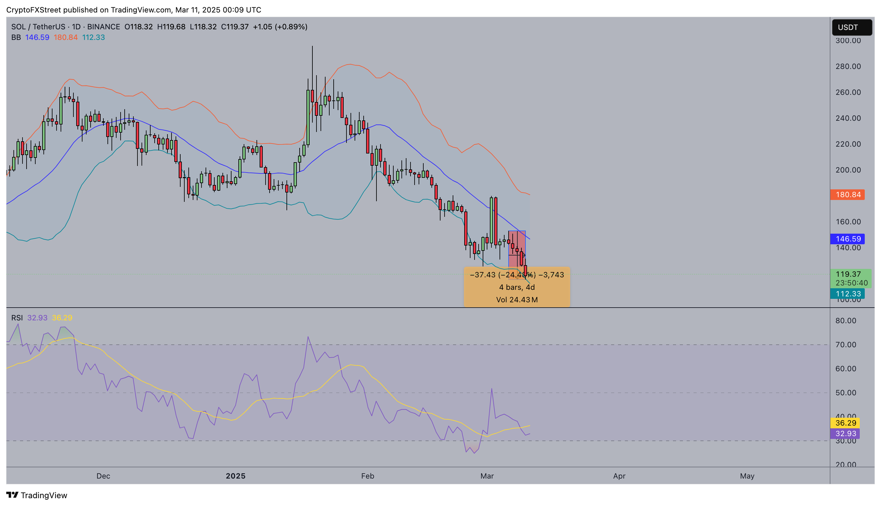 El gráfico diario muestra a SOL cotizando a 119.64$, con una caída del 24.4% en cuatro días, marcando su peor declive en meses. Las Bandas de Bollinger se están expandiendo hacia abajo, con la acción del precio de SOL firmemente anclada por debajo de la línea media en 149.13$, señalando una debilidad continua.