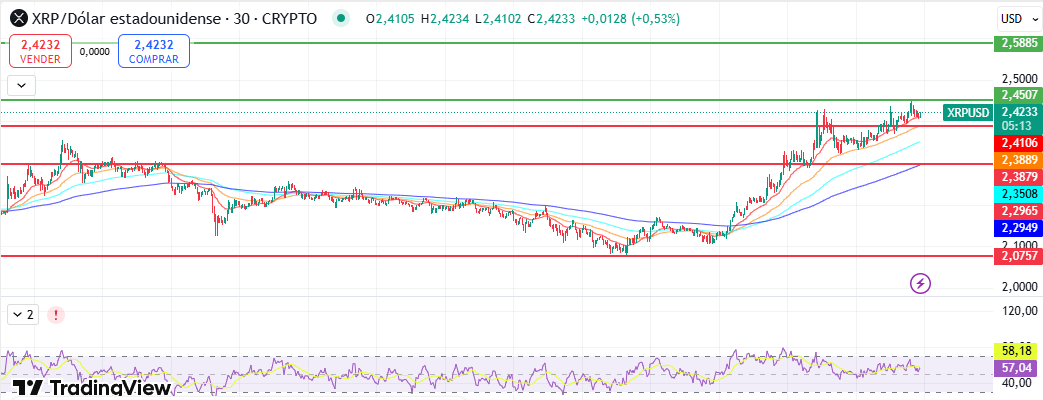 Al momento de la redacción, el precio de XRP cotiza en $2,42, con ganancias diarias del 2,9%, semanales del 10,4% y mensuales del 22%. Con este impulso, los traders proyectan un avance hacia el nivel clave de los $3.
