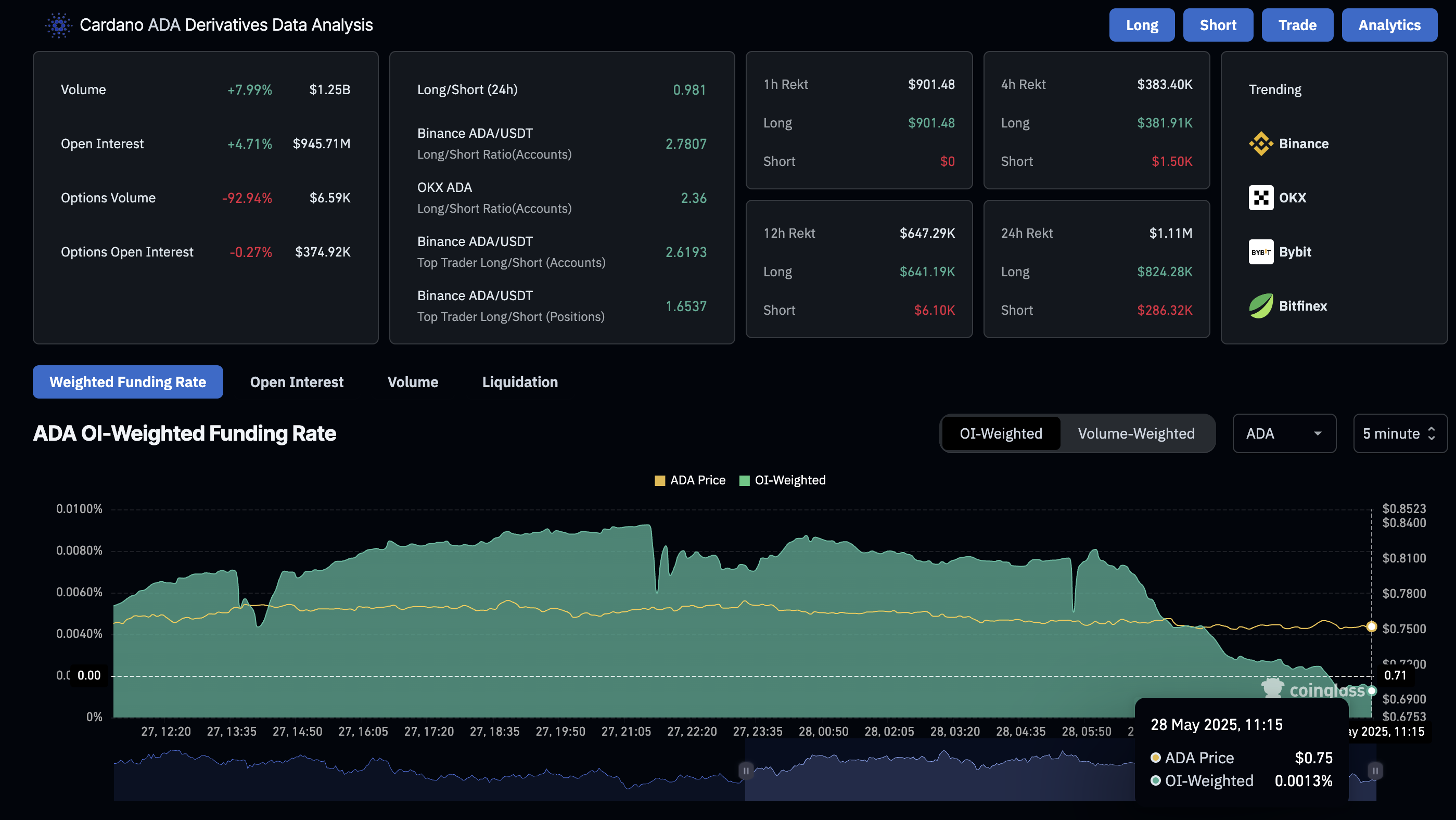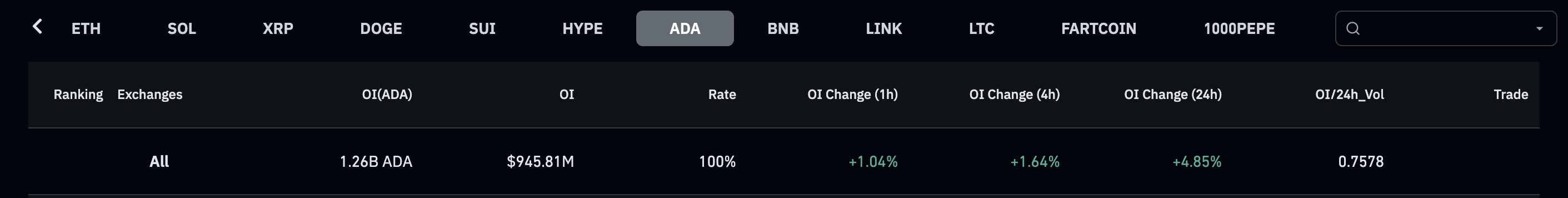 A medida que Cardano llega a un cruce crítico, las ambiciones de los operadores de ADA en el mercado de derivados enfrentan un gran impacto. Según Coinglass, el Interés Abierto (OI) de ADA ha aumentado más del 4% para alcanzar 945 millones de dólares, indicando una entrada de capital en los derivados de Cardano.