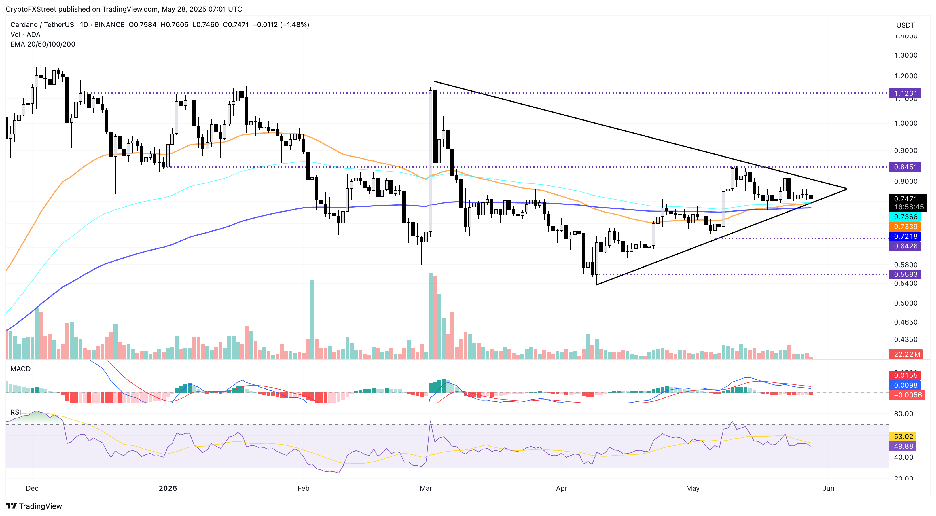 Cardano ha subido más del 9% en mayo, con una acción de precios volátil formando un patrón de triángulo en el gráfico diario. Los máximos más bajos del 3 de marzo, 12 de mayo y 23 de mayo forman una línea de tendencia descendente junto con los mínimos del 9 de abril, 6 de mayo y 25 de mayo, creando una línea de tendencia de soporte que completa el patrón de triángulo. El ADA se acerca al vértice del patrón con una creciente consolidación, insinuando una conclusión rápida.