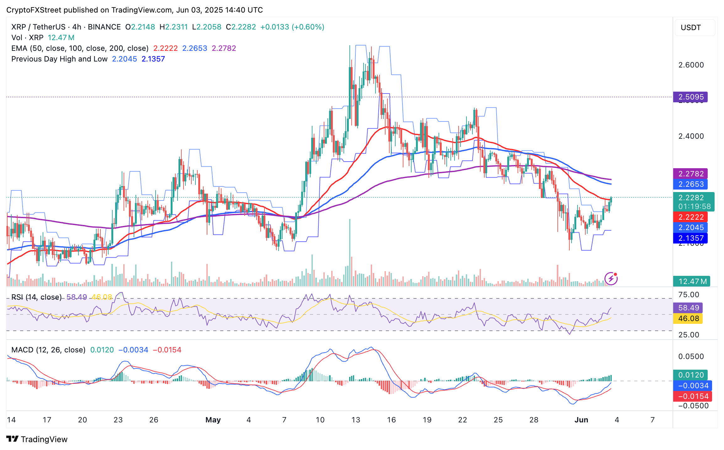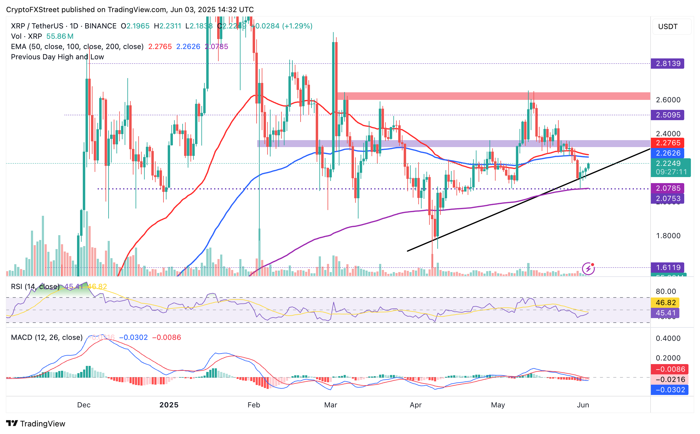El precio de XRP se mantiene por encima de una línea de tendencia ascendente clave tras rebotar en el soporte de la media móvil exponencial (EMA) de 200 días en 2.07 $. La reversión ascendente del Índice de Fuerza Relativa (RSI), que se acerca a la línea media de 50, sugiere que XRP podría ganar impulso en las próximas sesiones.