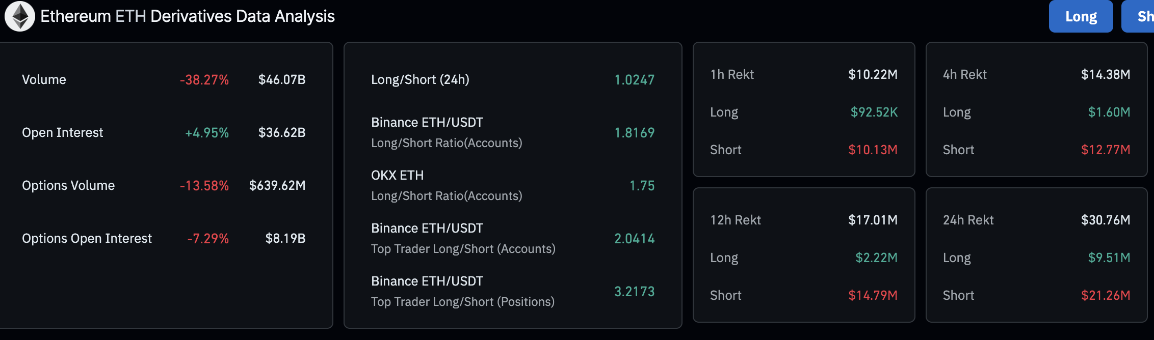 Un aumento cercano al 5% en el Interés Abierto (OI) del mercado de derivados de Ethereum a 37.000 millones de dólares en las últimas 24 horas refleja un sentimiento ligeramente mejorado en torno a la postura firme del presidente de EE.UU., Trump, sobre unirse al conflicto Israel-Irán. Las liquidaciones de posiciones cortas aumentaron el viernes, alcanzando los 21 millones de dólares en 24 horas en comparación con 10 millones en posiciones largas.