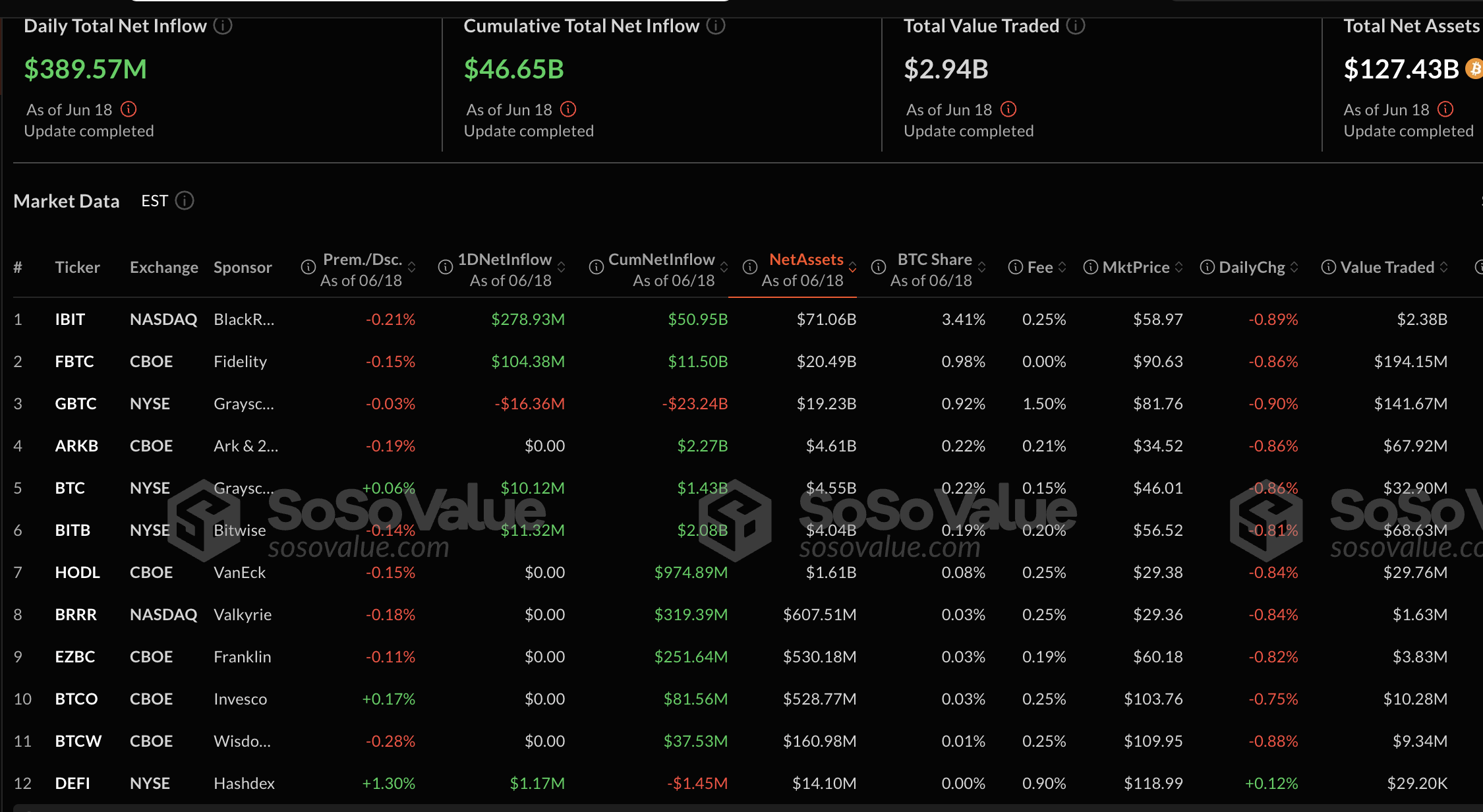El interés de los inversores institucionales se ha mantenido firme a pesar de las tensiones geopolíticas. Esto se ha reflejado en las entradas constantes en los Fondos Cotizados en Bolsa (ETFs) de EE.UU. SoSoValue muestra la entrada neta total de ETFs de BTC al contado en casi 47.000 millones de dólares y activos netos de 127.000 millones de dólares, acumulados desde enero de 2024.