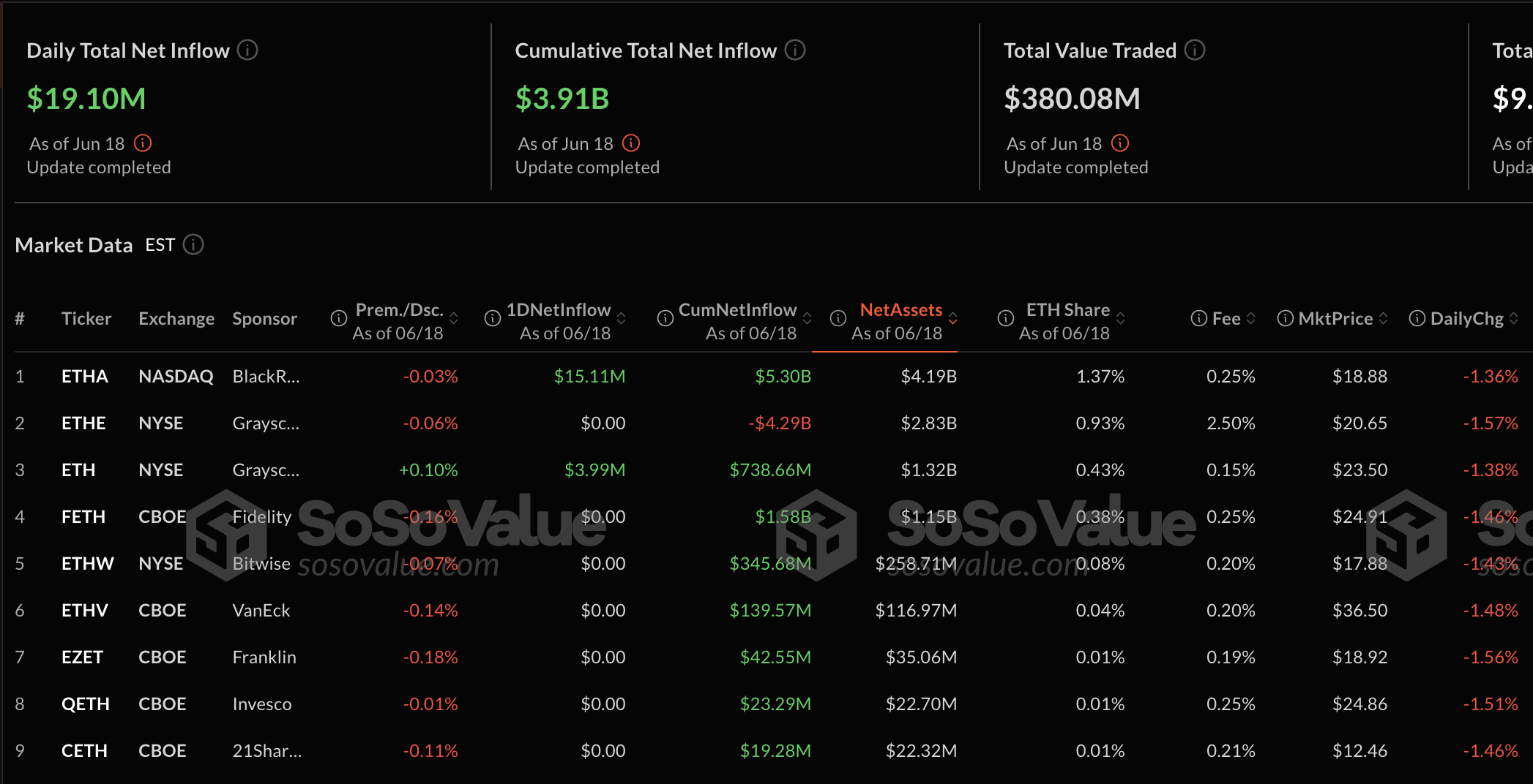 Estadísticas del ETF de Ethereum al contado | Fuente: SoSoValue