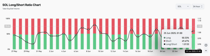 Esta tendencia indica que los jugadores institucionales se están posicionando para más alzas mientras la moneda se beneficia de la recuperación del mercado en general. Además, el ratio long/short de SOL respalda esta perspectiva alcista. Según Coinglass, este se encuentra en 1.013, reflejando una creciente confianza entre los traders de futuros de SOL.