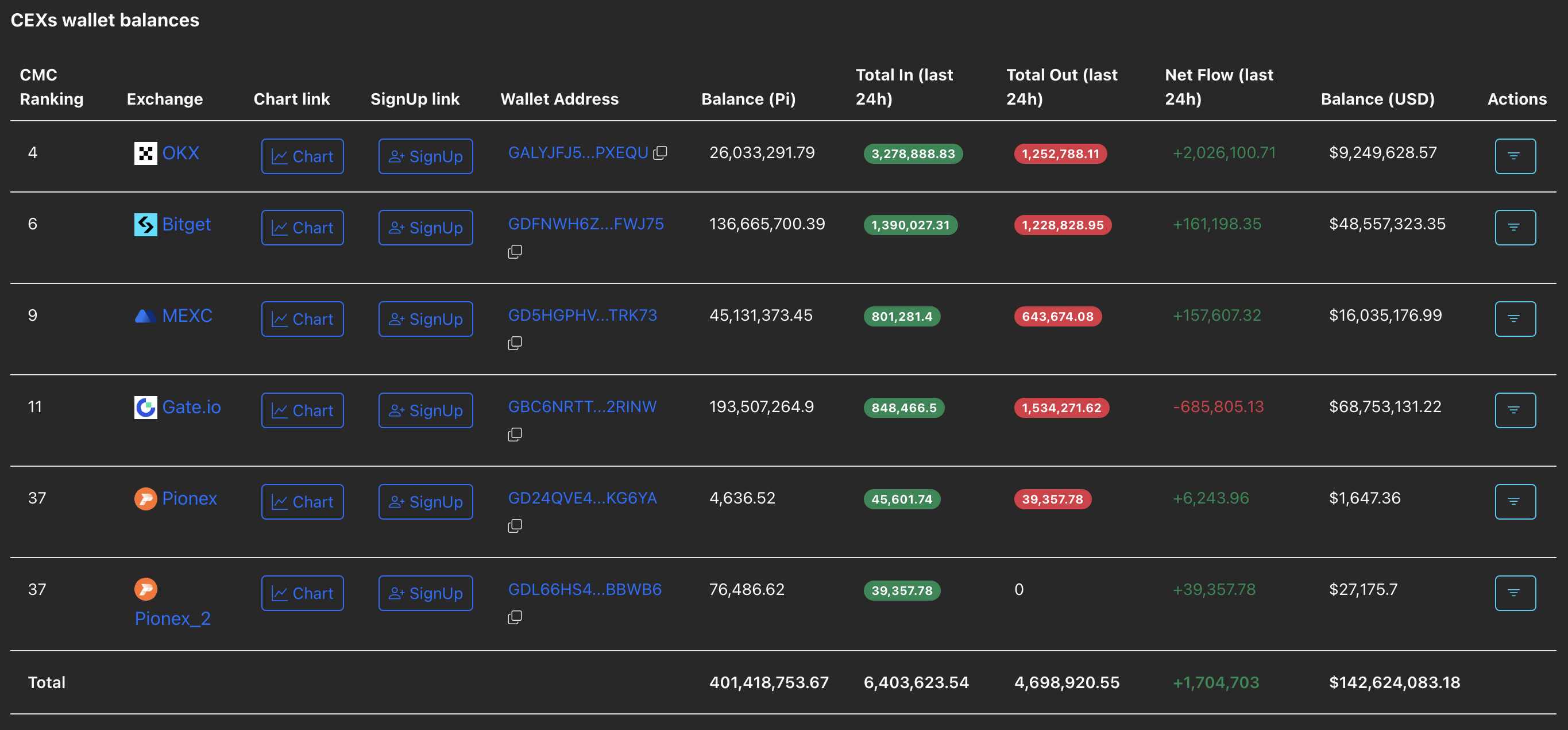 Los datos de PiScan muestran que los saldos de billetera de los CEX están aumentando a más de 401 millones de tokens PI, añadiendo alrededor de 1.7 millones de tokens en las últimas 24 horas. Actualmente, los CEX poseen el 5.16% del suministro circulante.