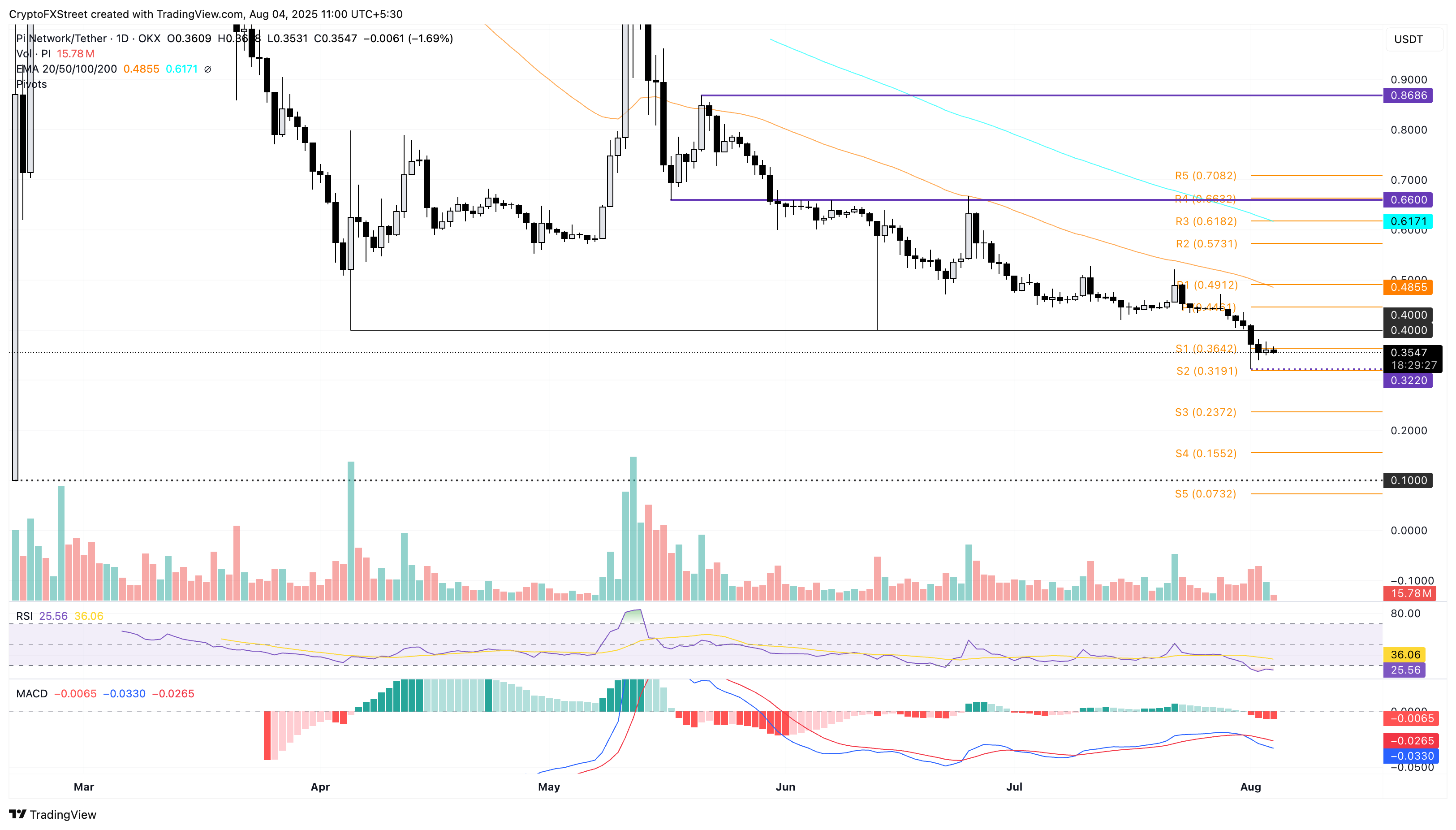 Pi Network baja un 2% en el momento de la publicación el lunes, sin poder superar el nivel pivot S1 en 0.3642$ – un soporte que ahora se ha convertido en resistencia. El token apunta al mínimo histórico registrado el viernes en 0.3220$, que está ligeramente por encima del nivel pivot S2 en 0.3191.