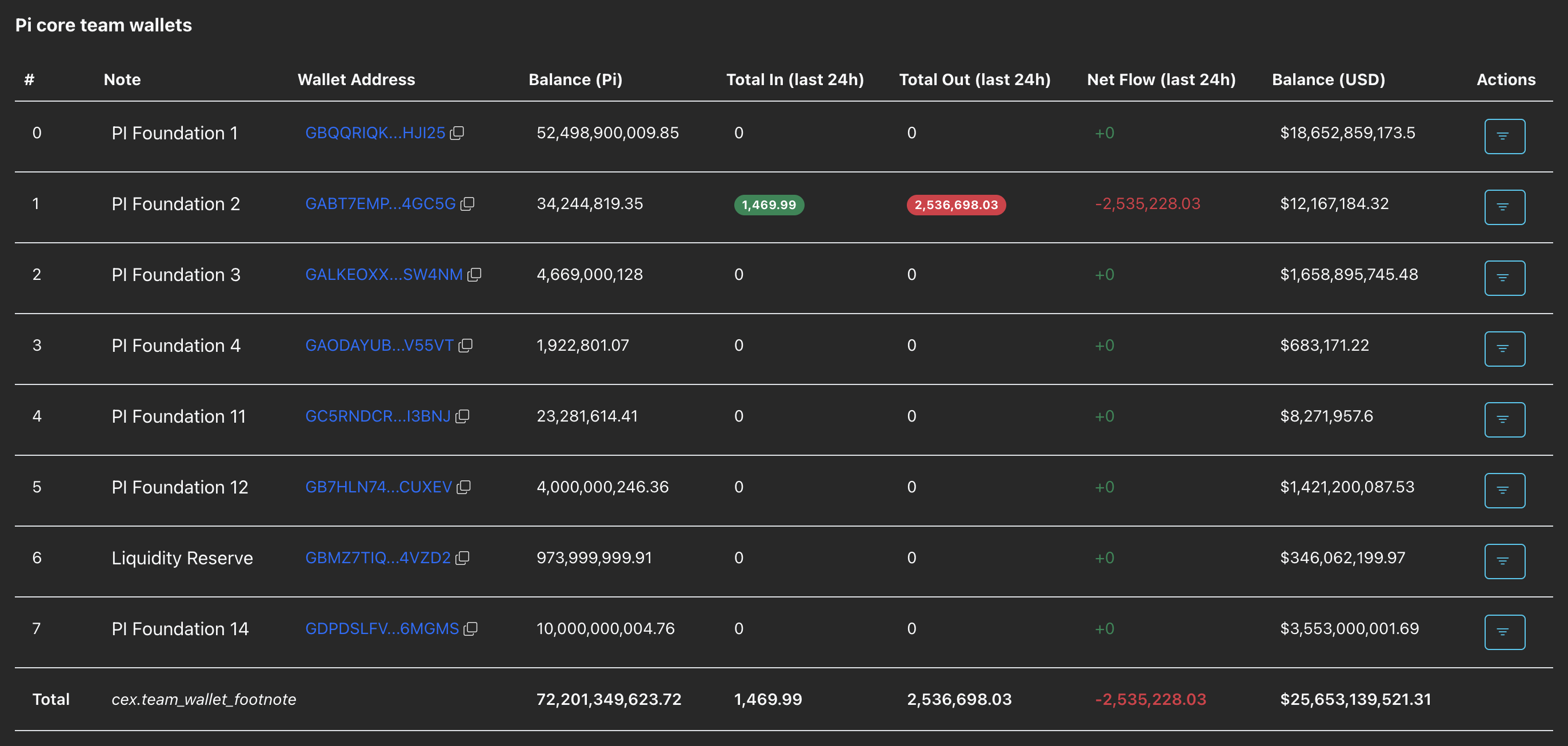 En medio de la venta masiva, la Fundación Pi ha vendido 2.53 millones de tokens en las últimas 24 horas. Esta venta por parte del equipo central sugiere una disminución de la confianza, aumentando el sentimiento de aversión al riesgo entre los inversores y resultando en una mayor presión de venta.