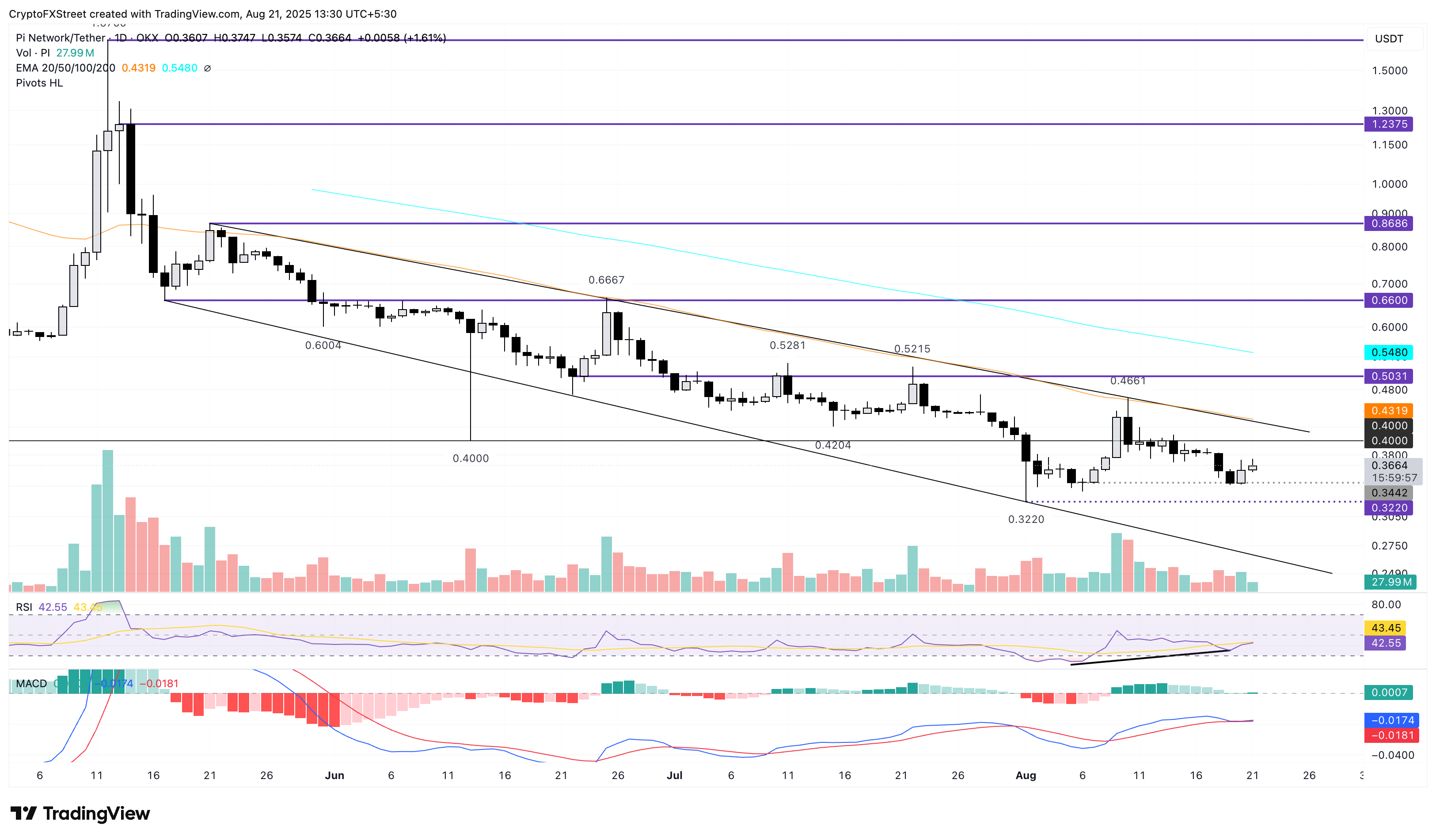 El token PI de Pi Network avanza casi un 1.50% en el momento de la publicación el jueves, extendiendo el aumento del 4.92% del miércoles. La reversión desde el nivel de soporte de 0.3442$ insinúa una reversión de patrón de doble suelo, previamente probado el 6 de agosto, con un objetivo en la media móvil exponencial (EMA) de 50 días en 0.4319$.