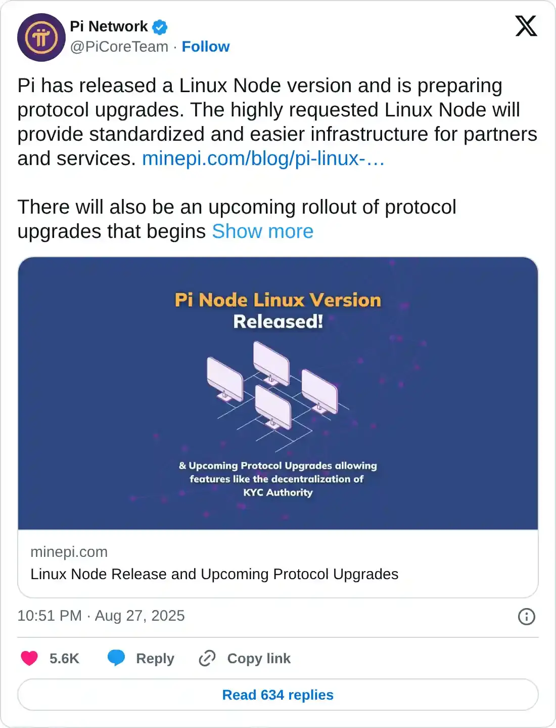 Al igual que otras versiones de SO, este lanzamiento recibirá autoridad de Conozca a su Cliente (KYC) integrada con las próximas actualizaciones, asegurando que la Pi Network siga siendo una blockchain verificada por KYC. Con el Pi Node ingresando al ecosistema de Linux, la red se acerca a la activación de la red principal, lo que permitirá a los pioneros depositar saldos de PI verificados y poner en marcha completamente el ecosistema de Pi.