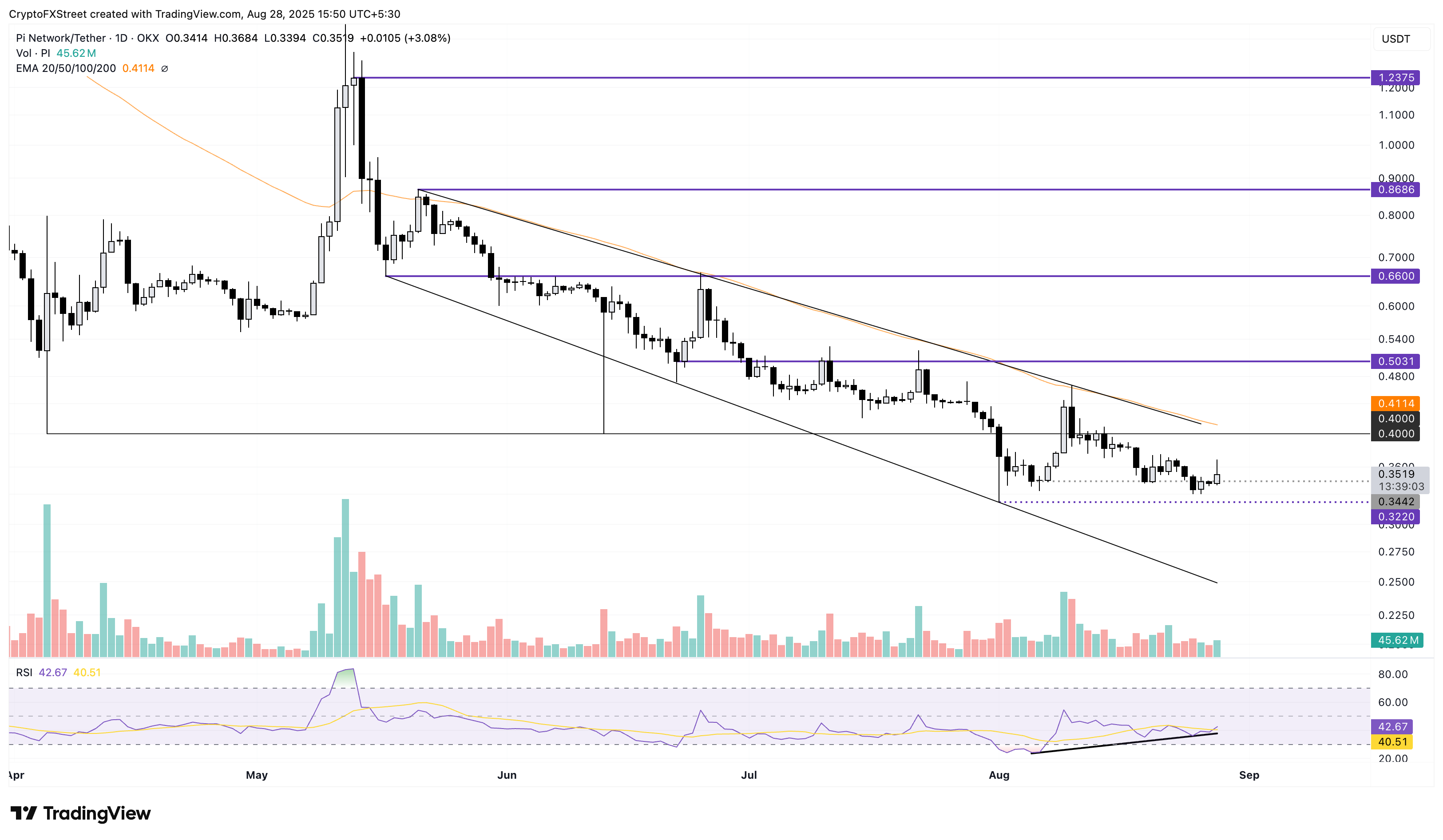 Pi Network se negocia a 0.3519$, apreciándose más de un 3% en el día mientras rebota desde el mínimo de 0.3220$ del 1 de agosto. La recuperación intradía señala un posible ciclo alcista dentro de un patrón de canal descendente más grande formado en el gráfico diario.