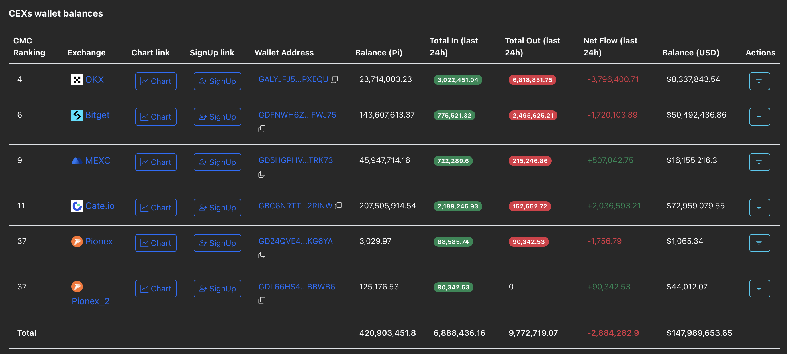 Los datos de PiScan muestran que los saldos de las carteras de los CEXs cayeron en 2.88 millones de tokens PI en las últimas 24 horas, alcanzando un saldo de 420.90 millones de PI. De los cinco intercambios alineados con Know Your Business (KYB) por la Fundación Pi, el intercambio OKX marcó la mayor salida con 3.79 millones de tokens PI.