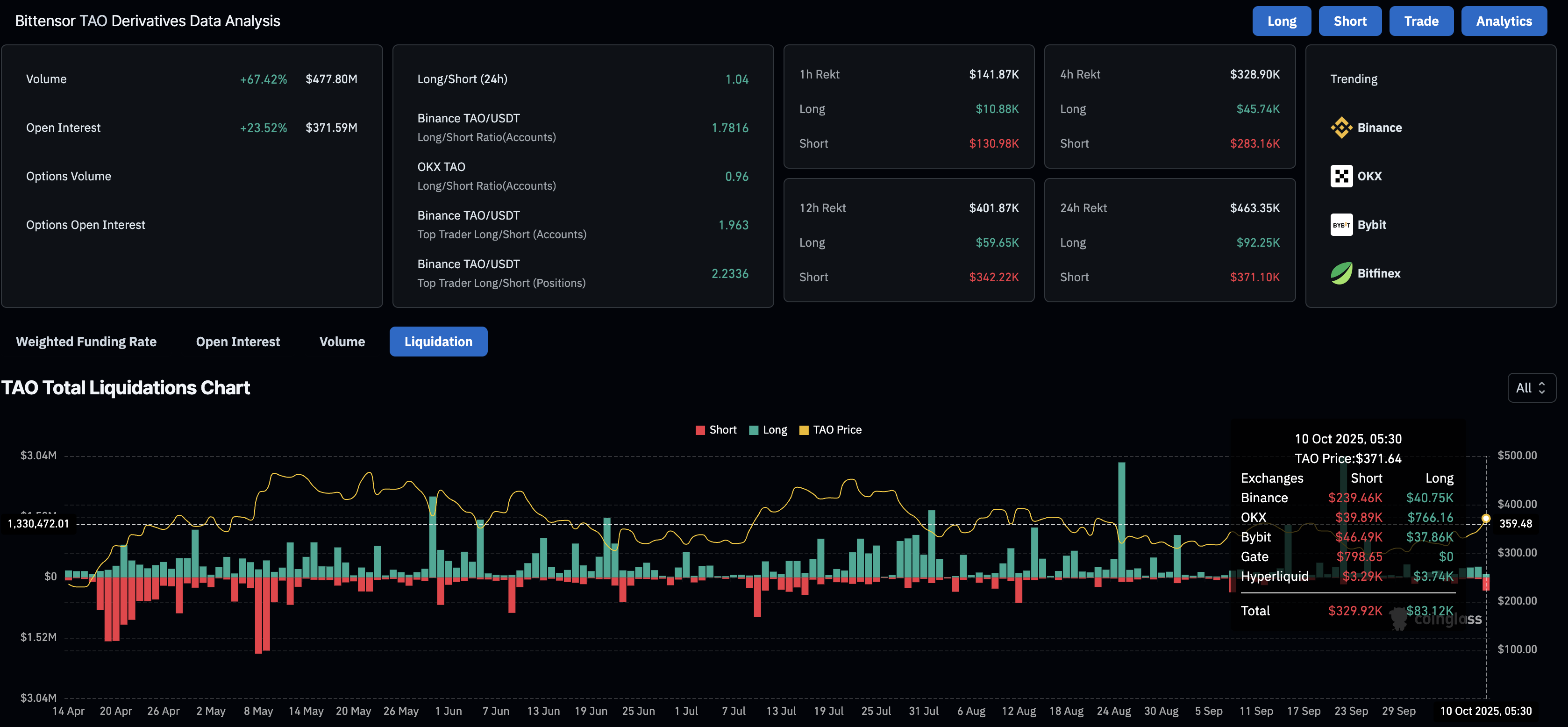 Sumando al potencial alcista, el interés minorista en torno a Bittensor ha aumentado. Los datos de CoinGlass muestran que el interés abierto (OI) de futuros de TAO ha subido un 23.52% en las últimas 24 horas, alcanzando los 371.59 millones de dólares. Este aumento de dos dígitos se refiere a un incremento en el valor de los contratos de futuros pendientes, indicando un aumento en la convicción de los traders de que TAO asegurará más ganancias.