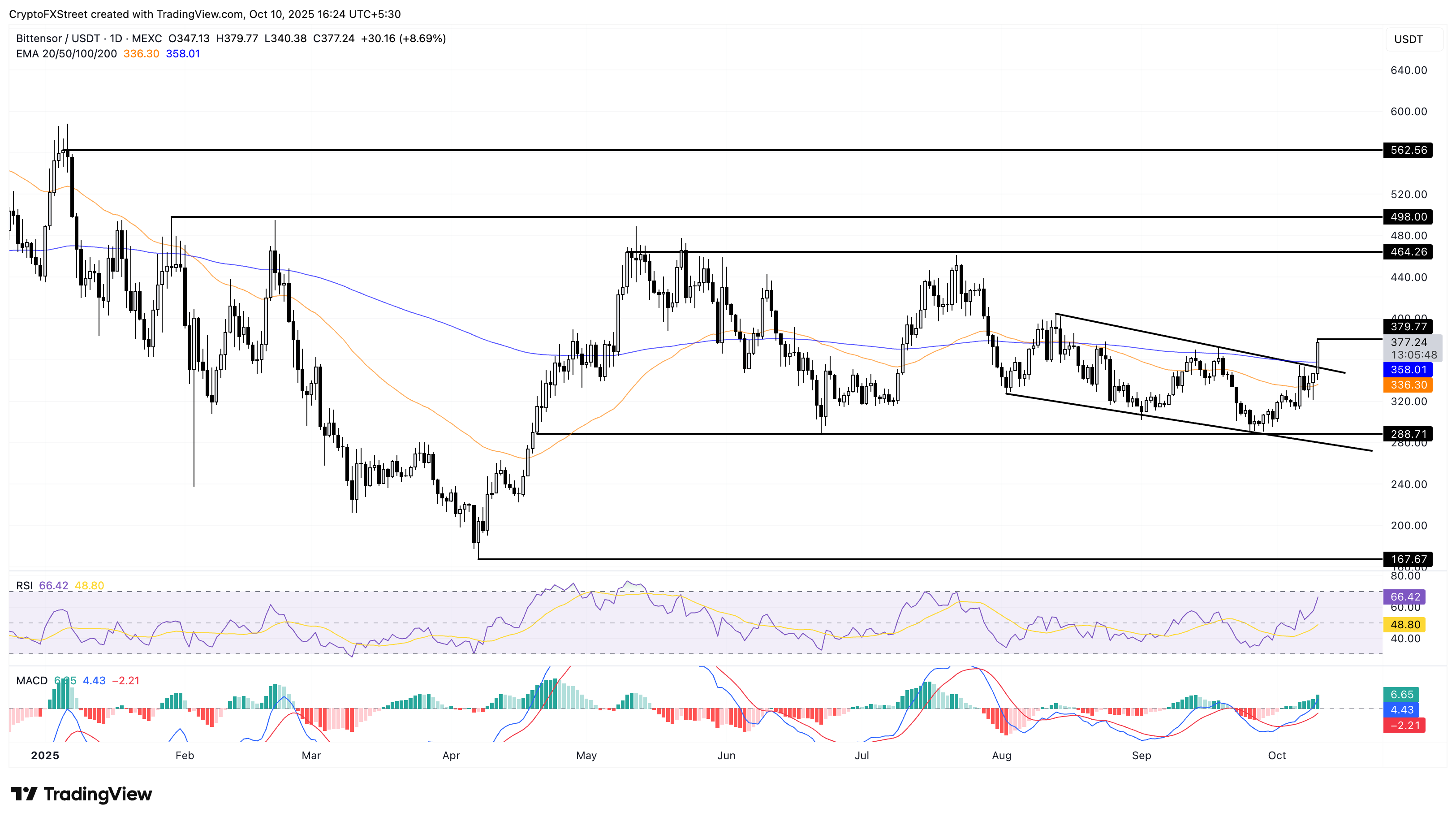 La recuperación de más del 7% de Bittensor en el momento de la prensa el viernes supera el rango descendente a corto plazo en el gráfico diario. El tercer día consecutivo de ganancias superó la media móvil exponencial (EMA) de 200 días en 358$, que actuó como resistencia dinámica a finales de agosto y septiembre.