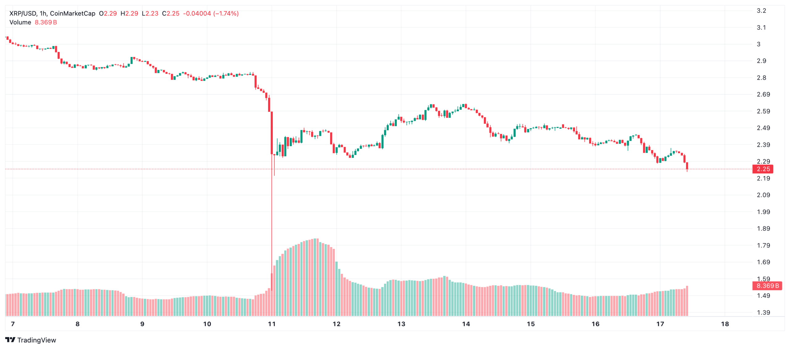 - El precio de XRP cae de $2.41 a $2.23 en dos semanas.