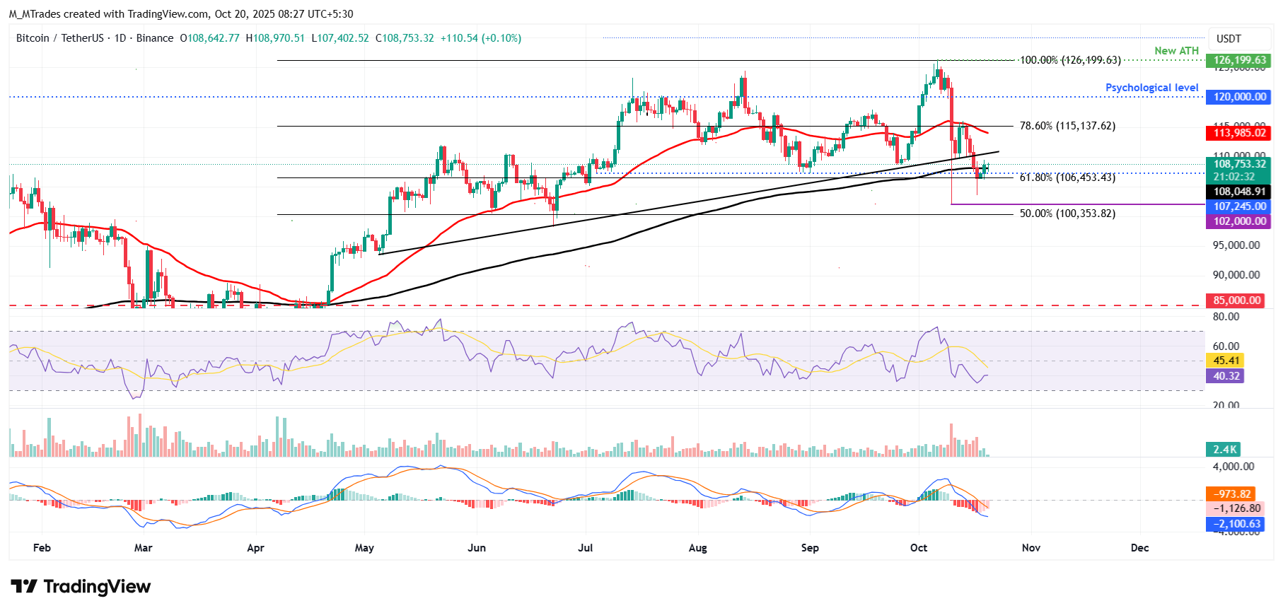 El precio del Bitcoin enfrentó rechazo de la media móvil exponencial (EMA) de 50 días en 113.950 $ el martes y cayó un 7.36% para el viernes. Sin embargo, el BTC encontró soporte alrededor del retroceso de Fibonacci del 61.8% en 106.453 $ el sábado y se recuperó un 2.22% al día siguiente. Al momento de escribir el lunes, el BTC ronda los 108.700 $.