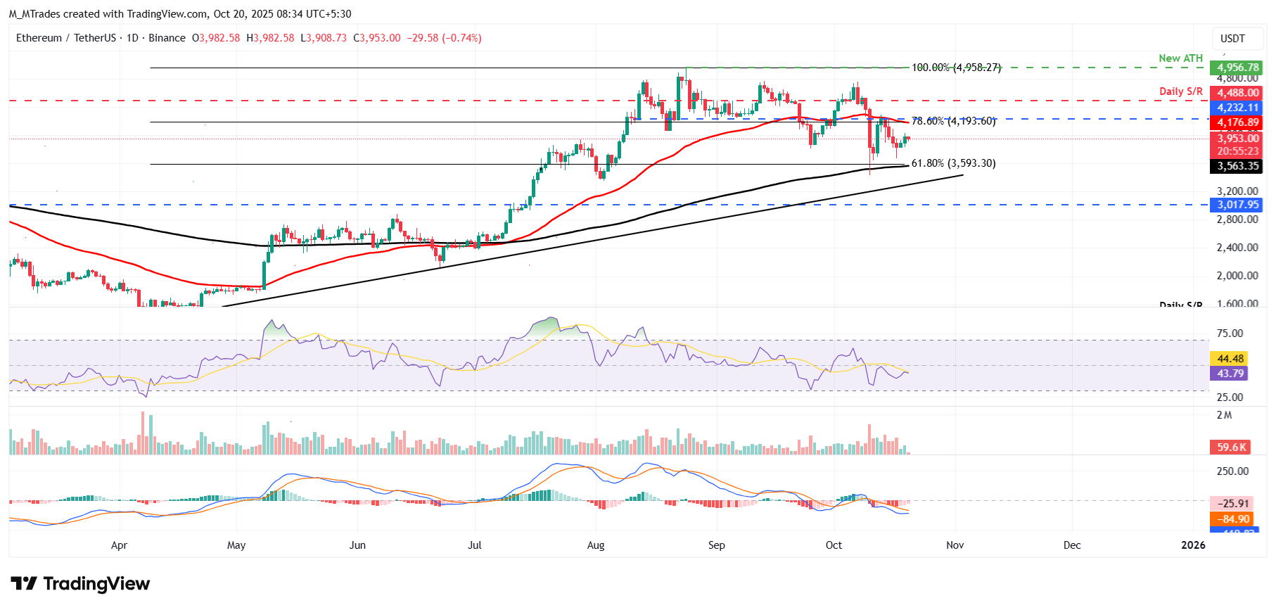 El precio de Ethereum corrigió más del 4% la semana pasada después de enfrentar rechazo en la resistencia diaria de 4.232 $. Al inicio de esta semana, el lunes, ronda los 3.953 $.