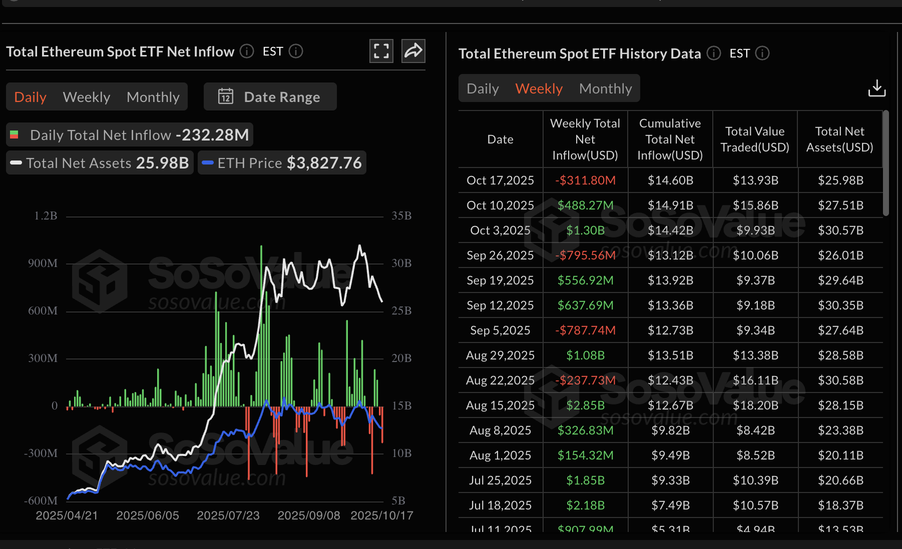 Los ETFs de Ethereum al contado, por otro lado, experimentaron salidas de 311,8 millones de dólares la semana pasada, reflejando el sentimiento averso al riesgo en el mercado de criptomonedas más amplio. La salida total el viernes promedió 232 millones de dólares, llevando el volumen total de entrada neta acumulativa a 14.600 millones de dólares, con activos netos de 25.980 millones de dólares.