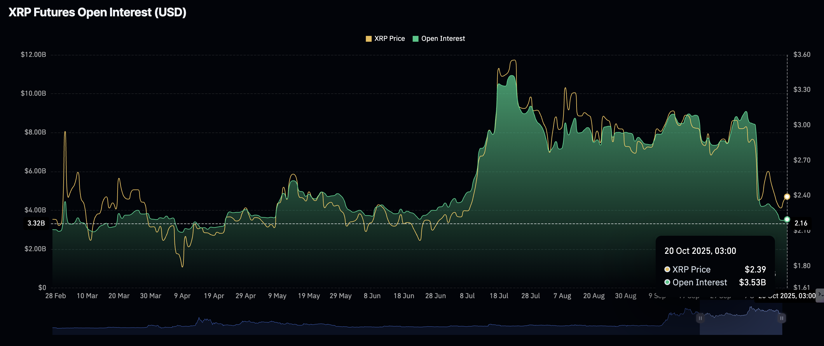 Mientras tanto, la demanda minorista de XRP sigue suprimida, como lo demuestra una caída masiva en el interés abierto de futuros (OI), que promedia 3.530 millones de dólares el lunes.