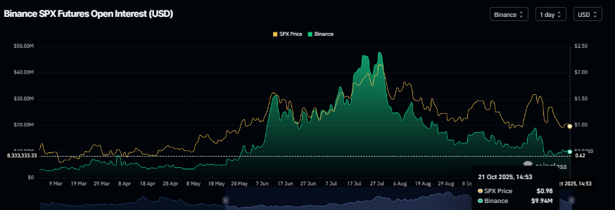 El Interés Abierto de futuros de Coinglass para la moneda meme SPX cae a 9.94 millones de dólares el martes, en comparación con 18.96 millones de dólares el 7 de octubre. Esta caída en el OI, que ha estado cayendo constantemente desde julio, señala una disminución en la participación de los inversores y refuerza un sentimiento de mercado debilitado para la moneda meme SPX.