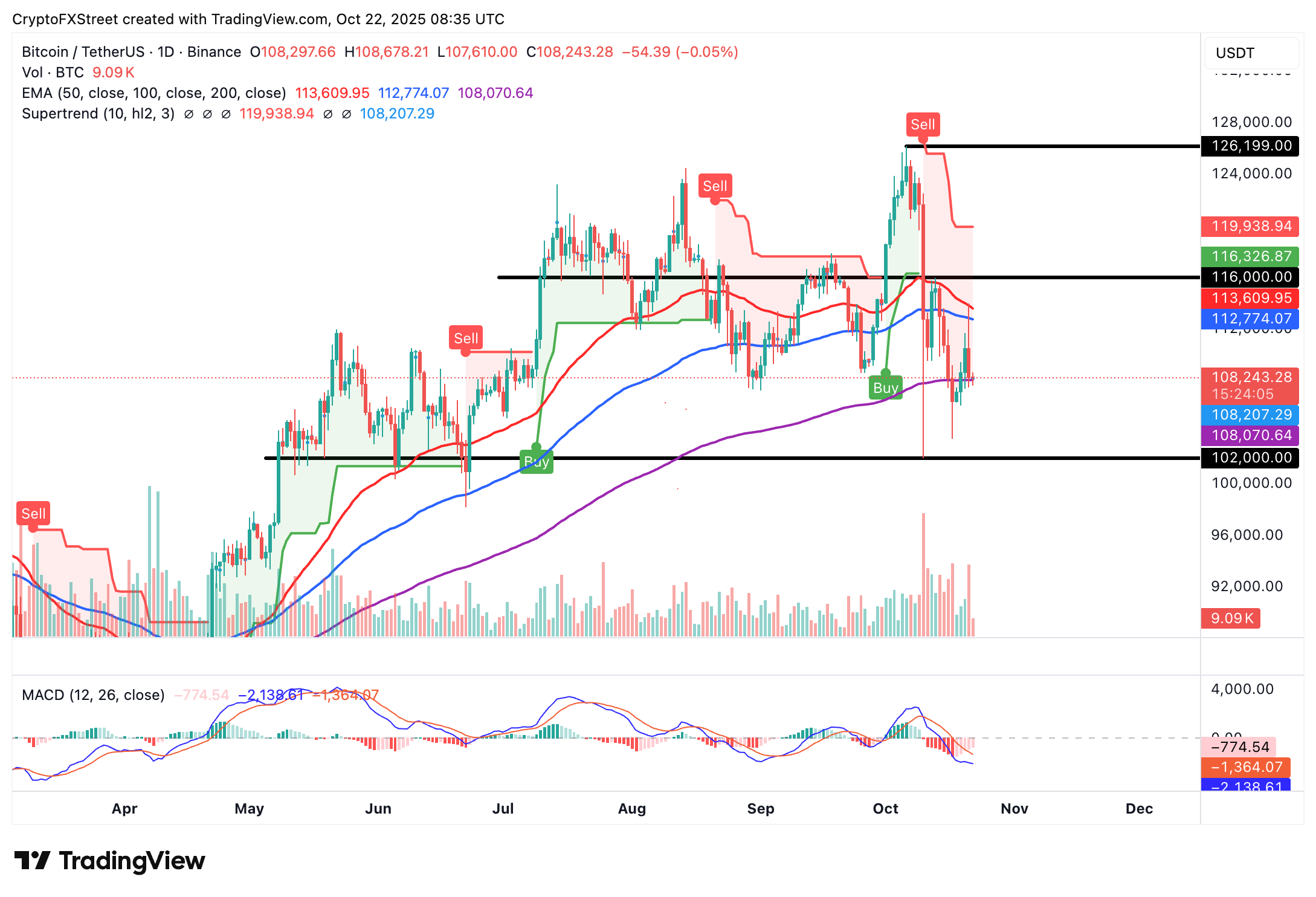 Los indicadores de Convergencia/Divergencia de Medias Móviles (MACD) y SuperTrend destacan una estructura técnica bajista, aumentando las probabilidades de extender la caída hacia los mínimos de octubre de BTC de 102.000$.