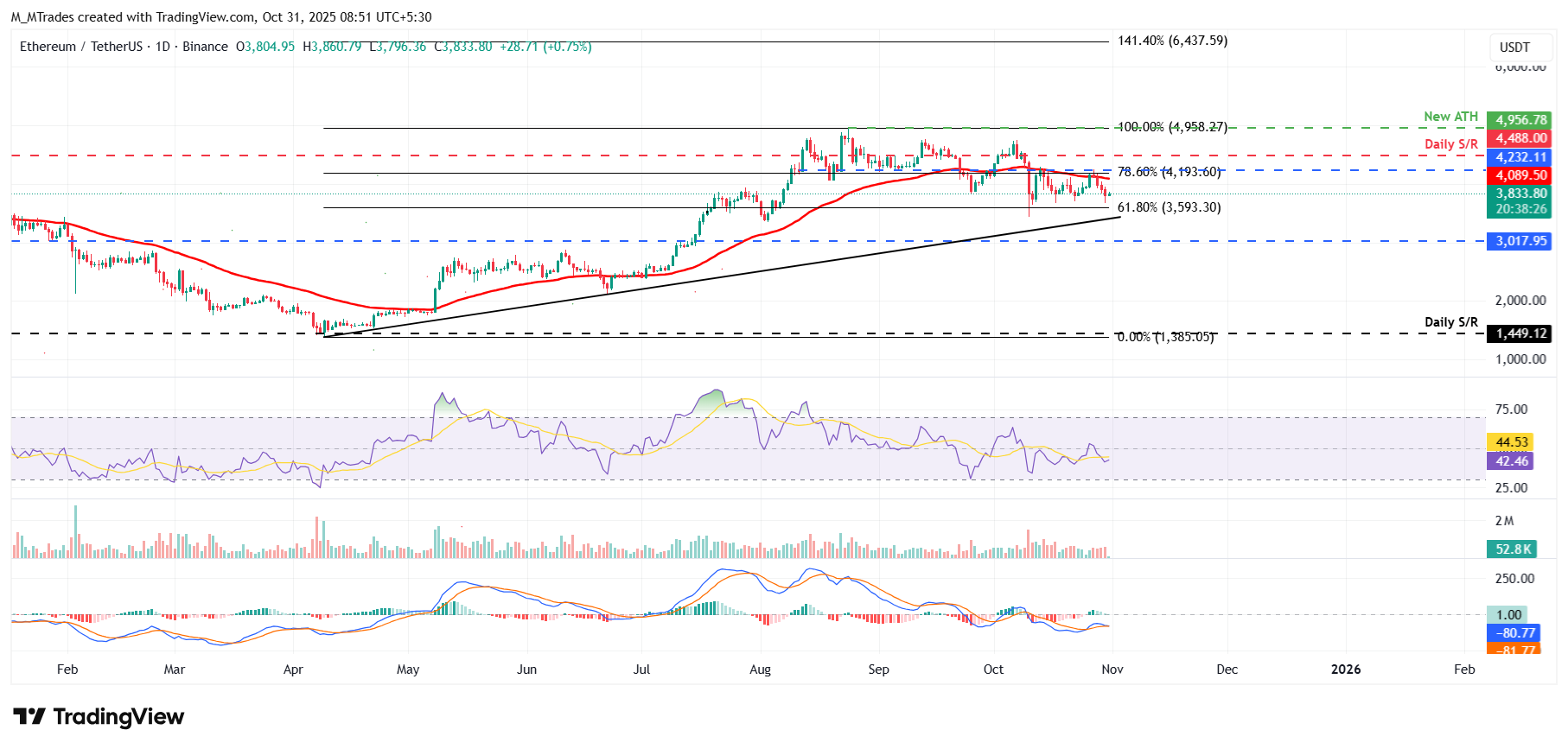 El precio de Ethereum enfrentó un rechazo del nivel de resistencia diario en 4.232$ el lunes y cayó un 8.86% para el jueves. Al momento de escribir el viernes, el ETH se sitúa alrededor de 3.833$.