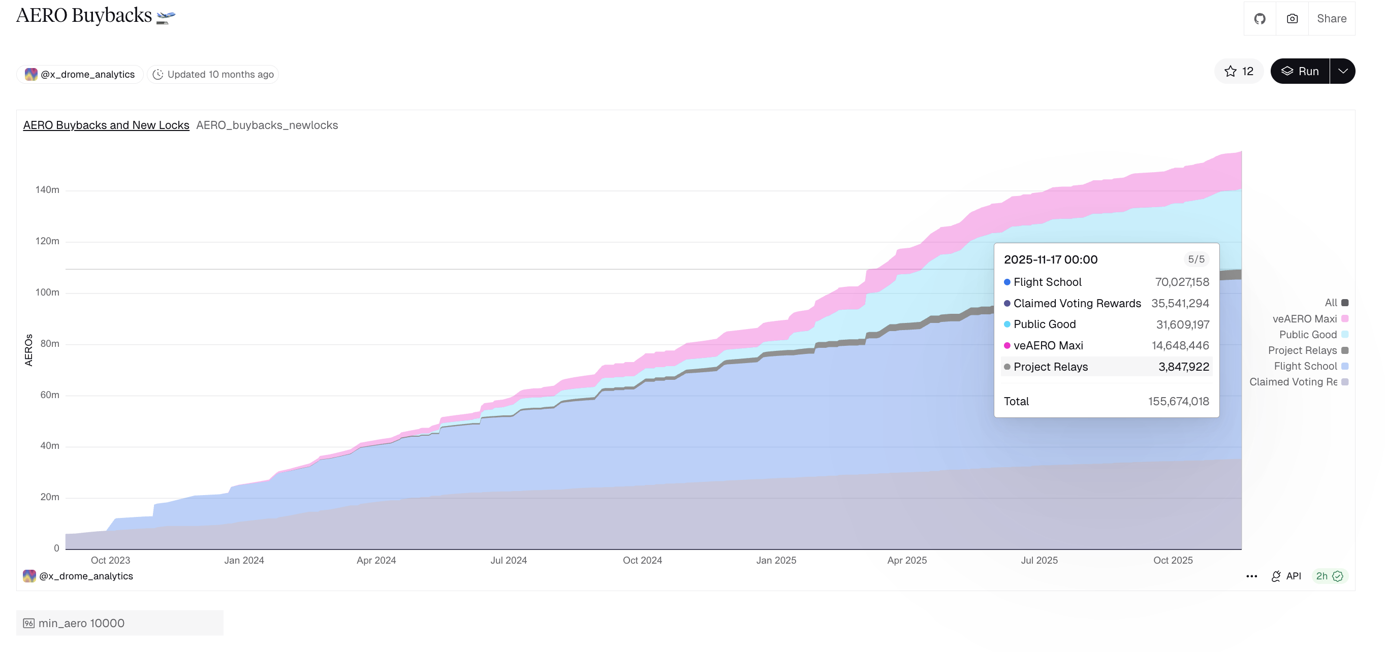 El programa de recompra de Aerodrome Finance incluye el Fondo de Bienes Públicos, Project Relay, Flight School, veAERO maxi y los bloqueos de tokens de recompensas de votación reclamadas. Hasta el miércoles, se han comprado más de 155 millones de tokens AERO con el fondo de Flight School, un programa de incentivos para usuarios de staking de AERO, con la mayor parte en 70 millones de tokens.