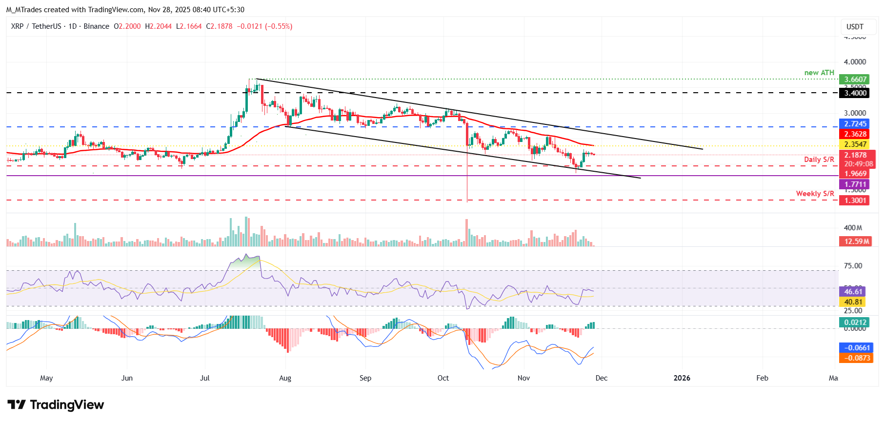 El precio de XRP volvió a probar y encontró soporte alrededor de la línea de tendencia inferior del canal descendente (dibujado conectando múltiples máximos y mínimos con dos líneas de tendencia) el sábado y se recuperó un 14.19% para el lunes. Sin embargo, XRP ha estado consolidándose alrededor del nivel de 2.20$ durante los últimos tres días. Al momento de escribir el viernes, se sitúa alrededor del mismo nivel.
