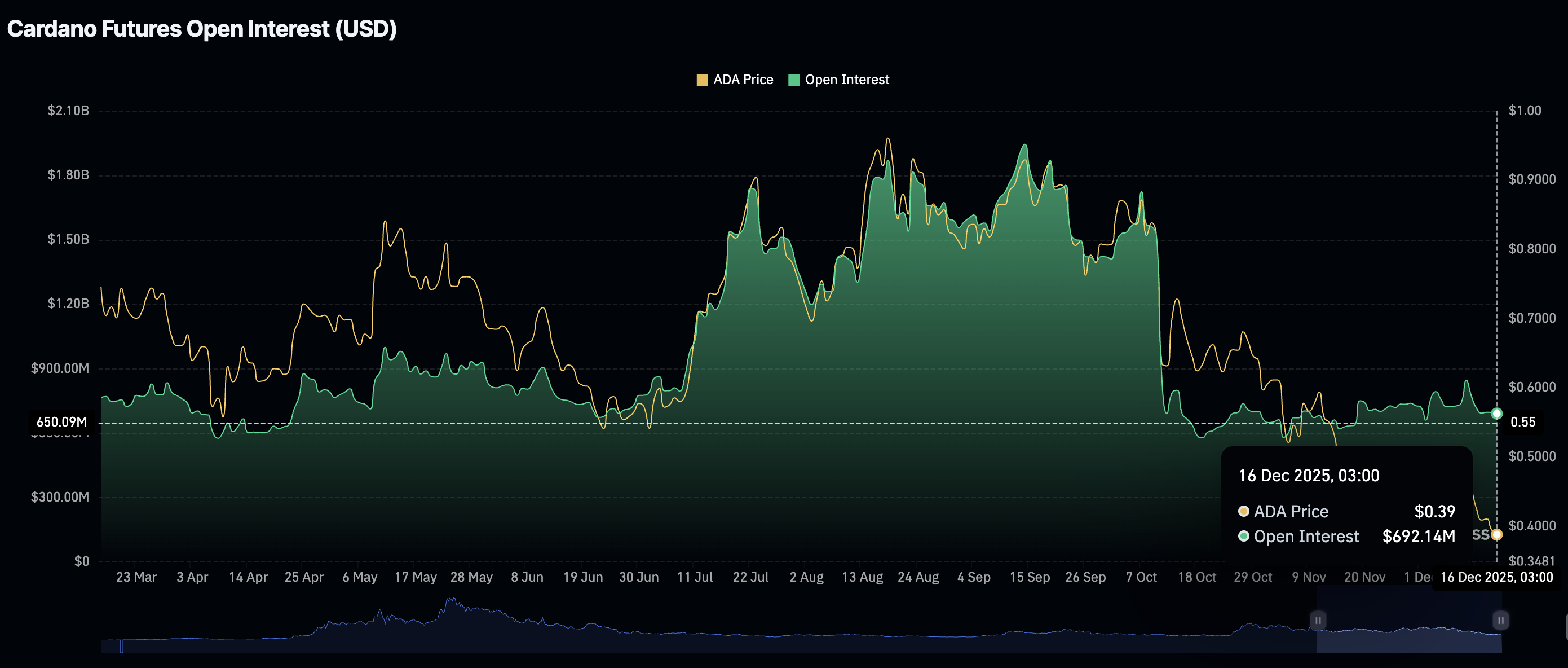 Cardano ha enfrentado, desde el colapso repentino del 10 de octubre, una disminución de la demanda, con el mercado de derivados tambaleándose. Los datos de CoinGlass muestran un interés abierto (OI) en futuros de 692 millones $, bajando de 842 millones $ el miércoles.
