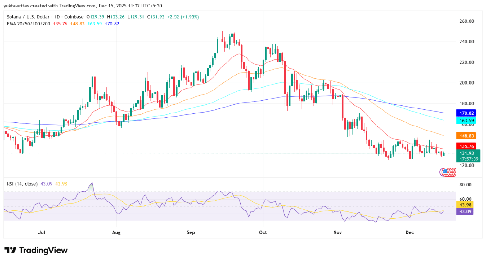 Para argumentar su análisis, Turakhiya explica que el precio de solana se mantiene firmemente por debajo de sus medias móviles (EMA) principales.