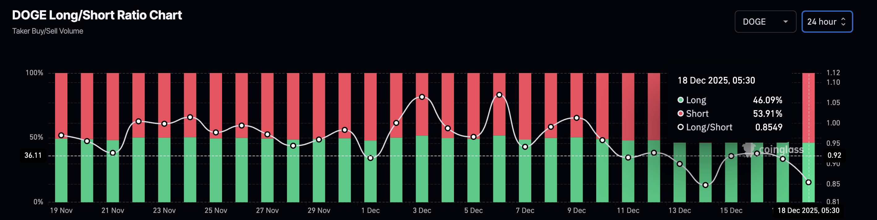 En el lado de los derivados, Dogecoin pierde fuerza a medida que el mercado de criptomonedas más amplio se prepara para el Índice de Precios al Consumidor (IPC) de EE.UU. el jueves y la decisión sobre la subida de tasas del Banco de Japón el viernes. Los datos de CoinGlass muestran que las posiciones cortas en los derivados de DOGE han aumentado al 53.91%, desde el 52.59% del miércoles. Una acumulación de posiciones cortas refleja un dominio de venta entre los operadores y se alinea con la eliminación de más de 5 millones de dólares en posiciones largas de DOGE en las últimas 24 horas.