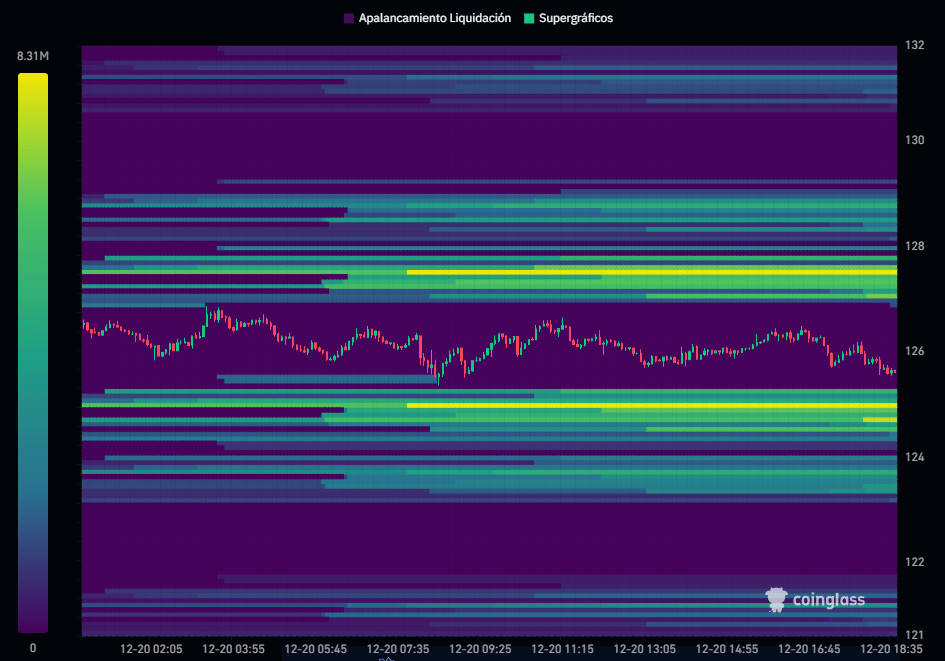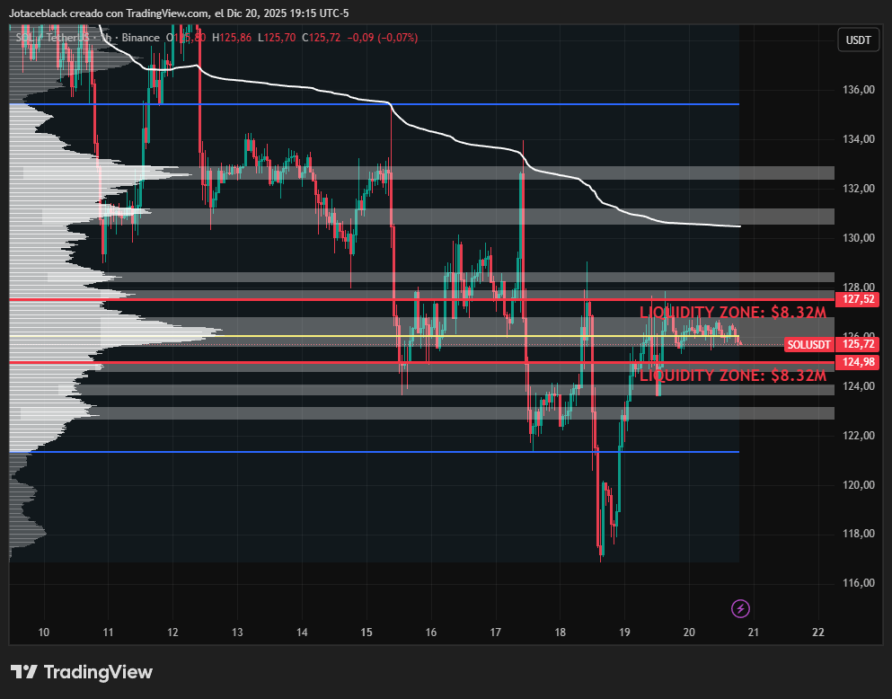 Desde las últimas horas del viernes, 19 de diciembre, SOL mostró un comportamiento lateral, manteniéndose en un rango estrecho dominado por 2 puntos claves en el mapa de liquidez. Este sábado 20, el activo cotiza en torno a los $125, nivel en el que ha intentado estabilizarse sin lograr un impulso sostenido.