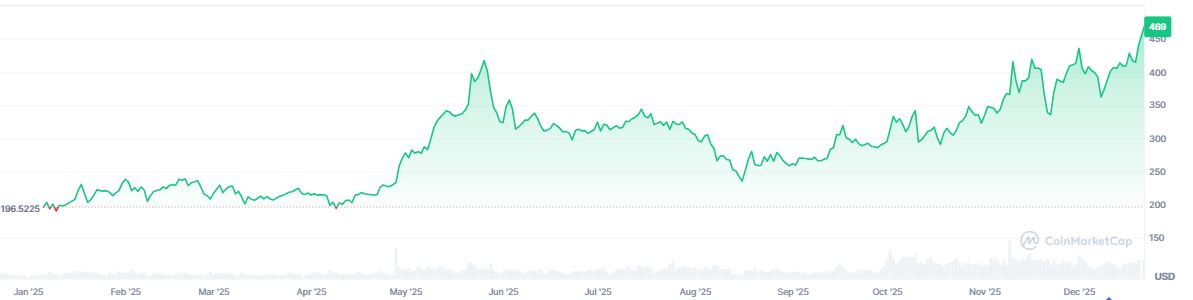 ZEC es uno de los activos destacados de 2025 y ha registrado una subida del 713%. Al momento de la publicación de esta nota, se negocia por encima de 434 dólares.