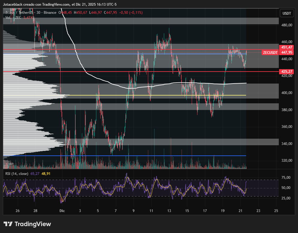 Actualmente, ZEC cotiza en torno a los $447,31 en Binance. La acción del precio en esta zona comienza a mostrar áreas de interés técnico, donde el mercado evalúa continuidad o agotamiento del movimiento previo. Estos niveles abren la posibilidad de escenarios correctivos de corto plazo, que se desarrollan en el análisis a continuación.