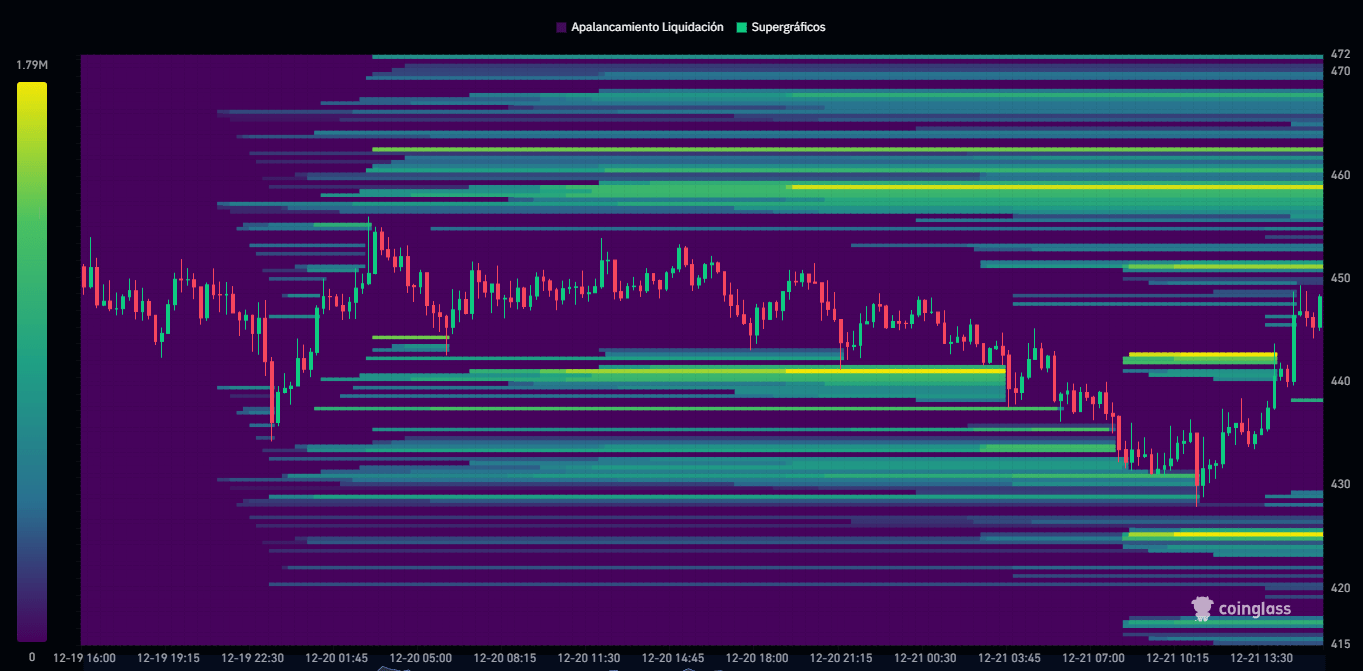 La mayor acumulación de liquidaciones se localiza por encima del precio actual, especialmente entre los $450–$460, donde se observan más de $11 millones acumulados. Esta zona actúa como un imán de liquidez, sugiriendo que cualquier intento de rebote podría extenderse hacia ese nivel antes de enfrentar una presión vendedora más significativa.