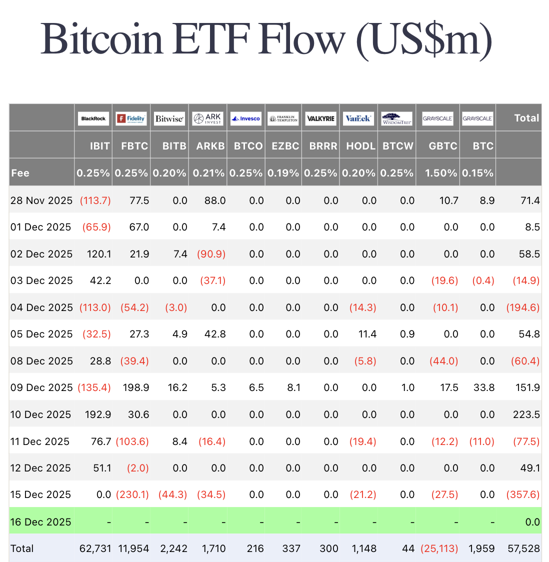 Una de las categorías más grandes de ballenas, instituciones como las empresas de Tesorería de Activos Digitales (DAT) y los mineros, o bien vendieron sus tenencias o retiraron capital de los Fondos Cotizados en Bolsa (ETFs). Los datos de flujo de fondos de Farside muestran capital retirado de los ETFs en las últimas dos semanas.