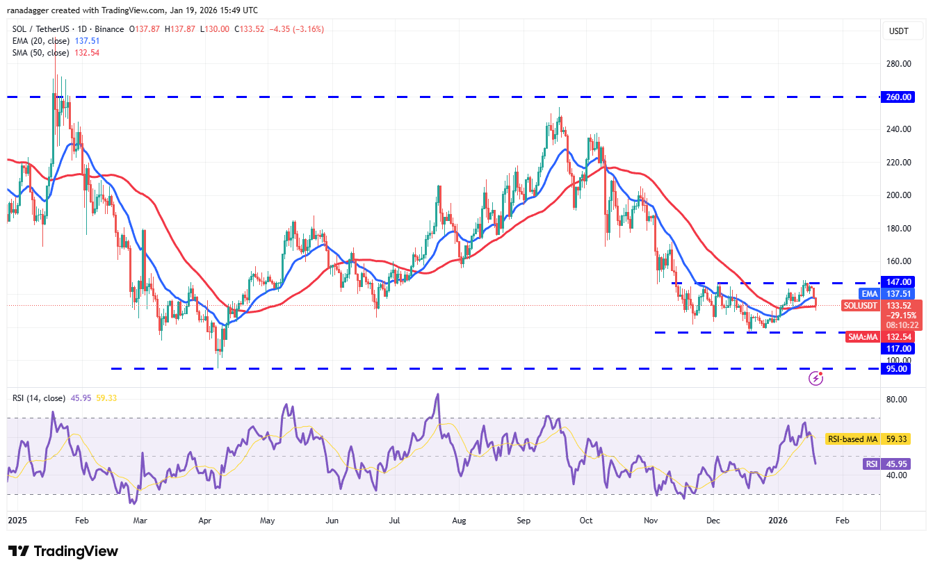 Solana (SOL) retrocedió desde la resistencia de USD 147 y ha alcanzado la SMA de 50 días (USD 132), lo que indica que los bajistas están activos en niveles superiores.