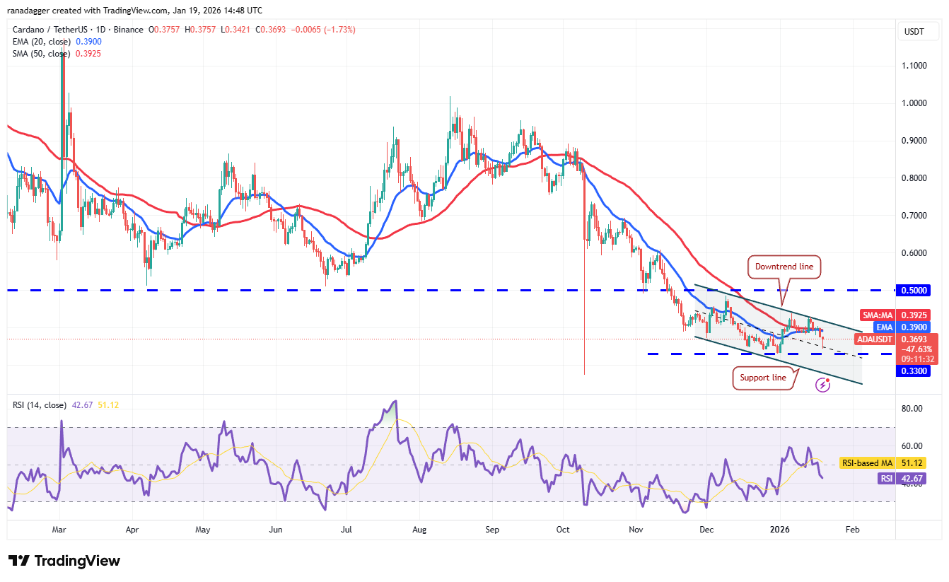 Si el precio se recupera del nivel de USD 0,33 con fuerza, los alcistas intentarán nuevamente impulsar el par ADA/USDT por encima de la línea de tendencia bajista. Si tienen éxito, el precio de Cardano podría alcanzar el nivel de ruptura de USD 0,50.