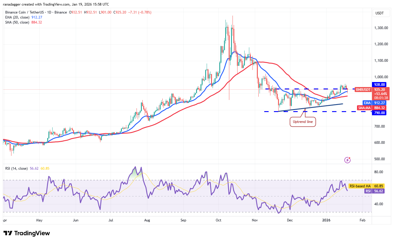 Los vendedores hicieron caer el precio de BNB (BNB) por debajo de la EMA de 20 días (USD 912) el lunes, pero la cola larga en la vela muestra compras en niveles inferiores.