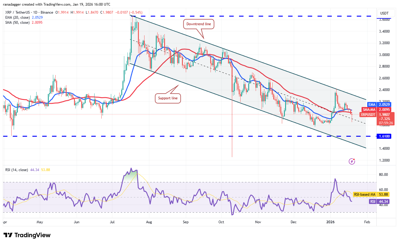 Los bajistas intentarán fortalecer su posición tirando del precio hacia la sólida zona de soporte entre USD 1,61 y la línea de soporte. Si el precio rebota con fuerza desde la zona de soporte, indica que el par XRP/USDT podría permanecer dentro del canal durante más tiempo.