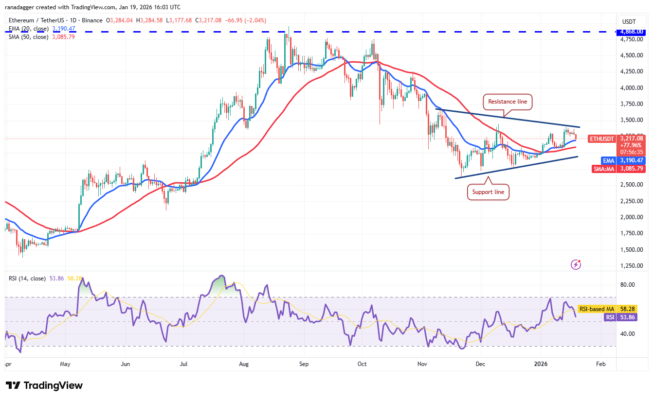 La EMA de 20 días ligeramente ascendente (USD 3.190) y el RSI cerca del punto medio no indican una clara ventaja ni para los alcistas ni para los bajistas. Si el precio cierra por debajo de la EMA de 20 días, el par ETH/USDT podría prolongar su estancia dentro del triángulo.