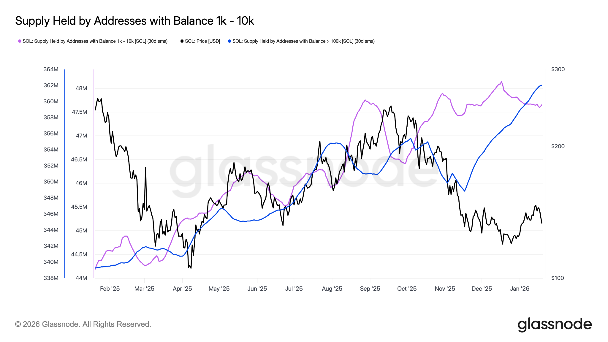 Los datos de Glassnode revelan que las direcciones de ballenas que poseen entre 1.000 y 10.000 tokens han aumentado considerablemente desde finales de noviembre de 2025, como se muestra en el gráfico siguiente. Estas entidades poseen ahora aproximadamente 48 millones de SOL, alrededor del 9% del suministro total en circulación.