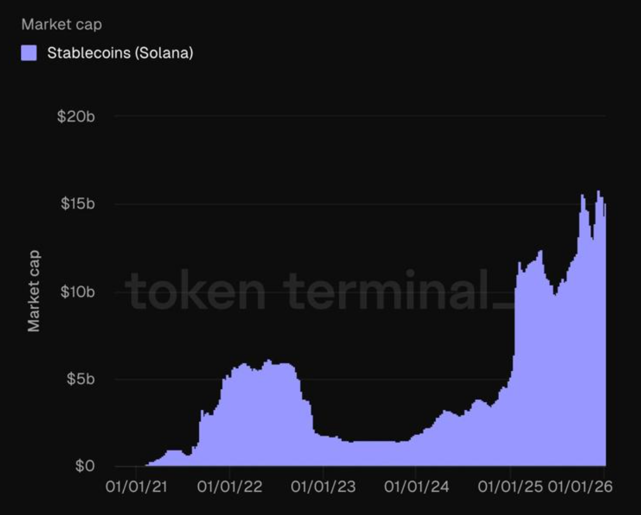 Mientras tanto, el suministro de stablecoins de Solana se ha disparado más de un 15% en los últimos siete días, alcanzando un máximo histórico de USD 15.000 millones, según datos de Token Terminal.