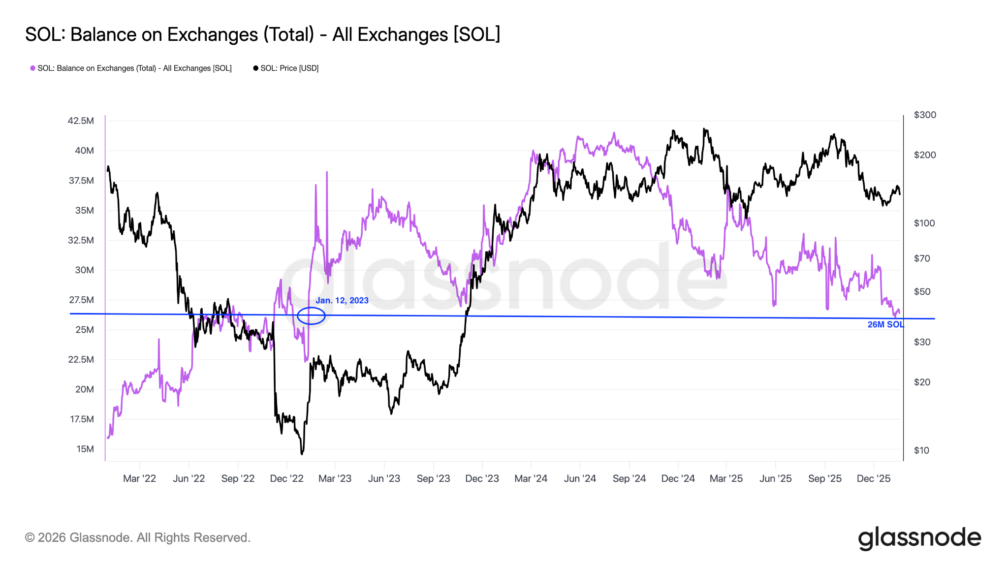 Se ha producido una disminución sustancial del suministro de SOL en exchanges desde finales de noviembre de 2025, como lo demuestran los datos de Glassnode. El gráfico siguiente muestra que el saldo de SOL en las bolsas cayó en 5 millones hasta los 26.058.693 el 14 de enero, niveles que no se veían desde el 12 de enero de 2023.