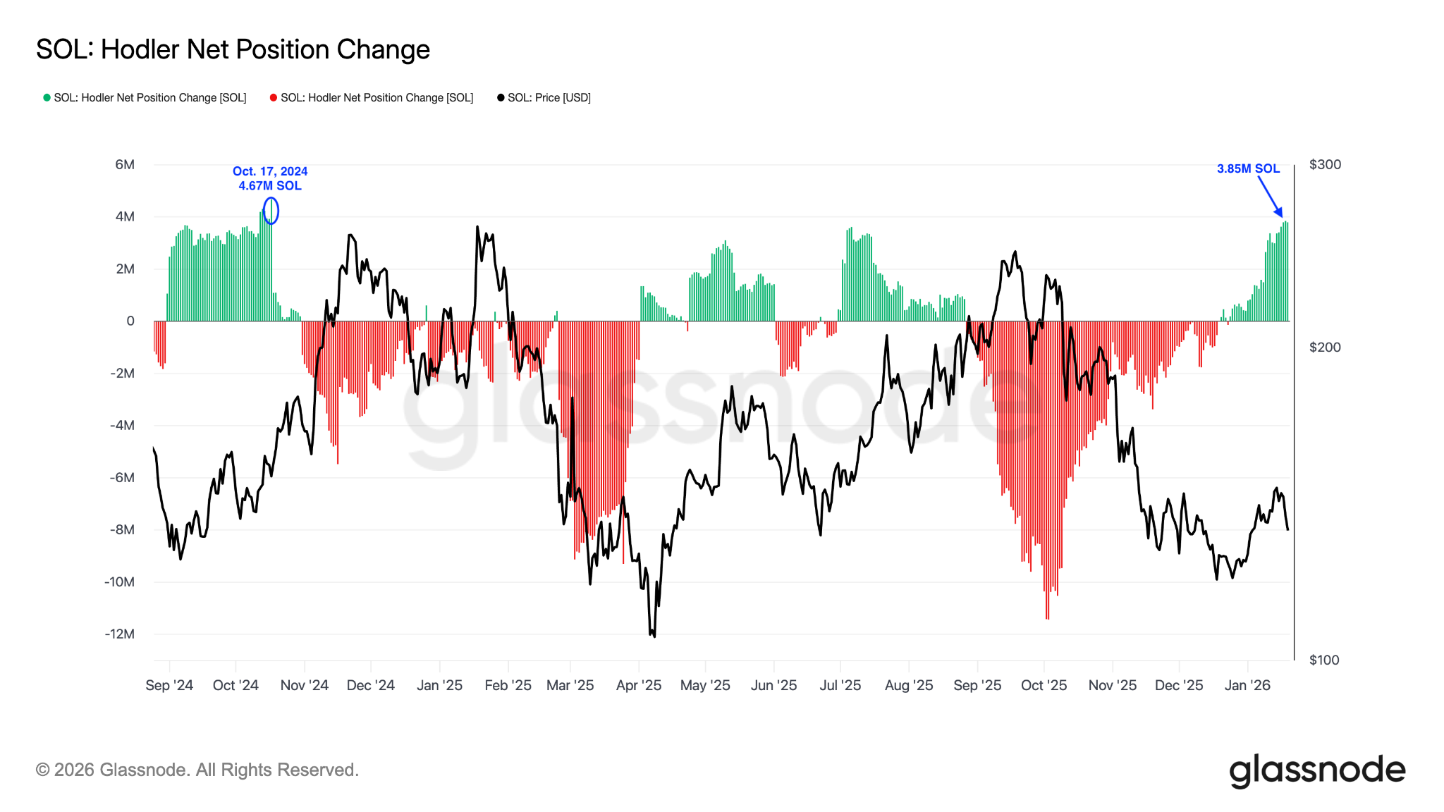 El cambio en la posición neta de Hodler ha sido positivo desde la última semana de diciembre de 2025, alcanzando el domingo un máximo de 15 meses de 3,85 millones de SOL. En otras palabras, los tenedores han vuelto a acumular SOL en previsión de nuevas subidas de precios.