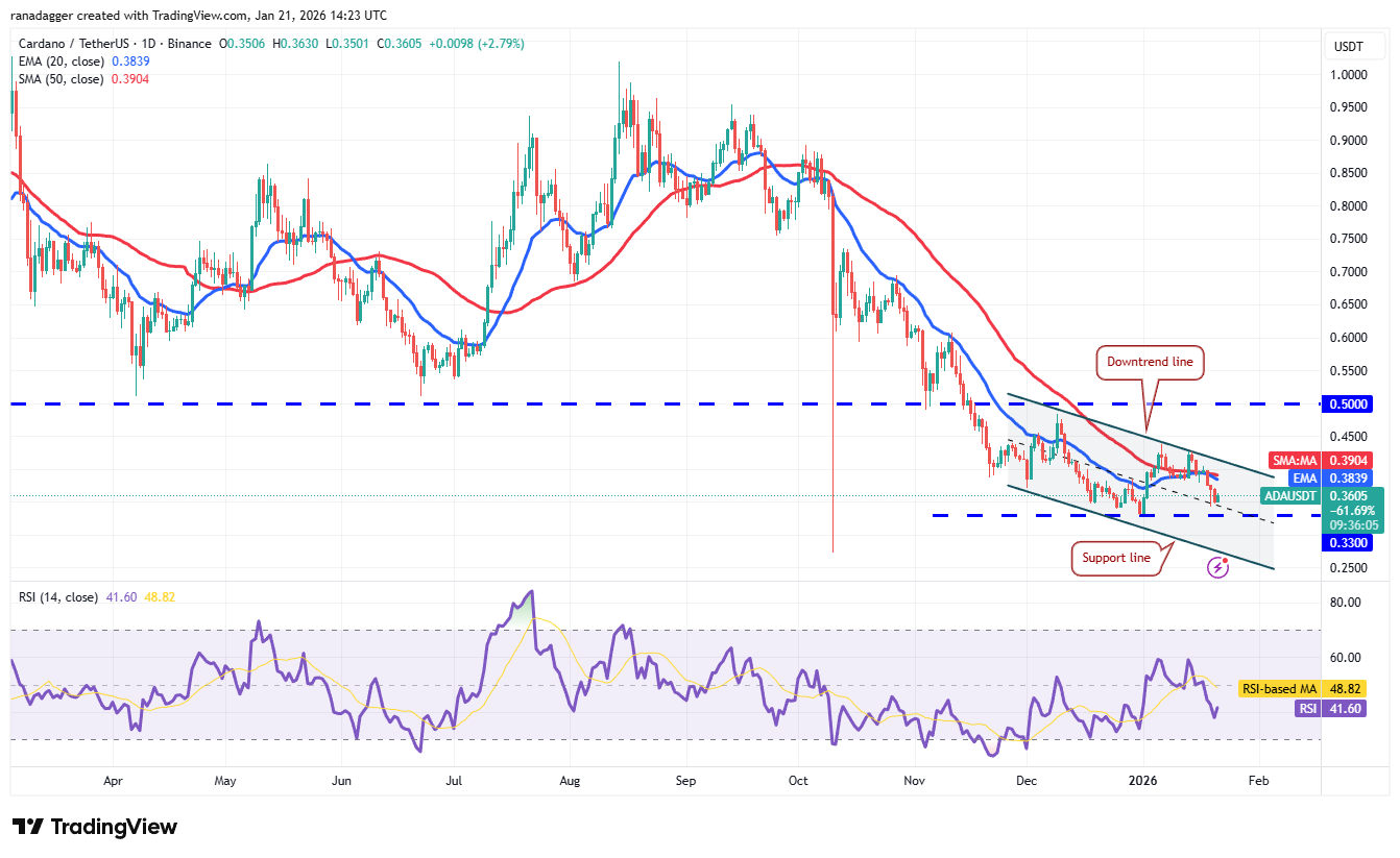 Cardano (ADA) está intentando encontrar soporte cerca del nivel de 0,33 dólares, pero se espera que la recuperación encuentre ventas en la zona entre las medias móviles y la línea de tendencia bajista.
