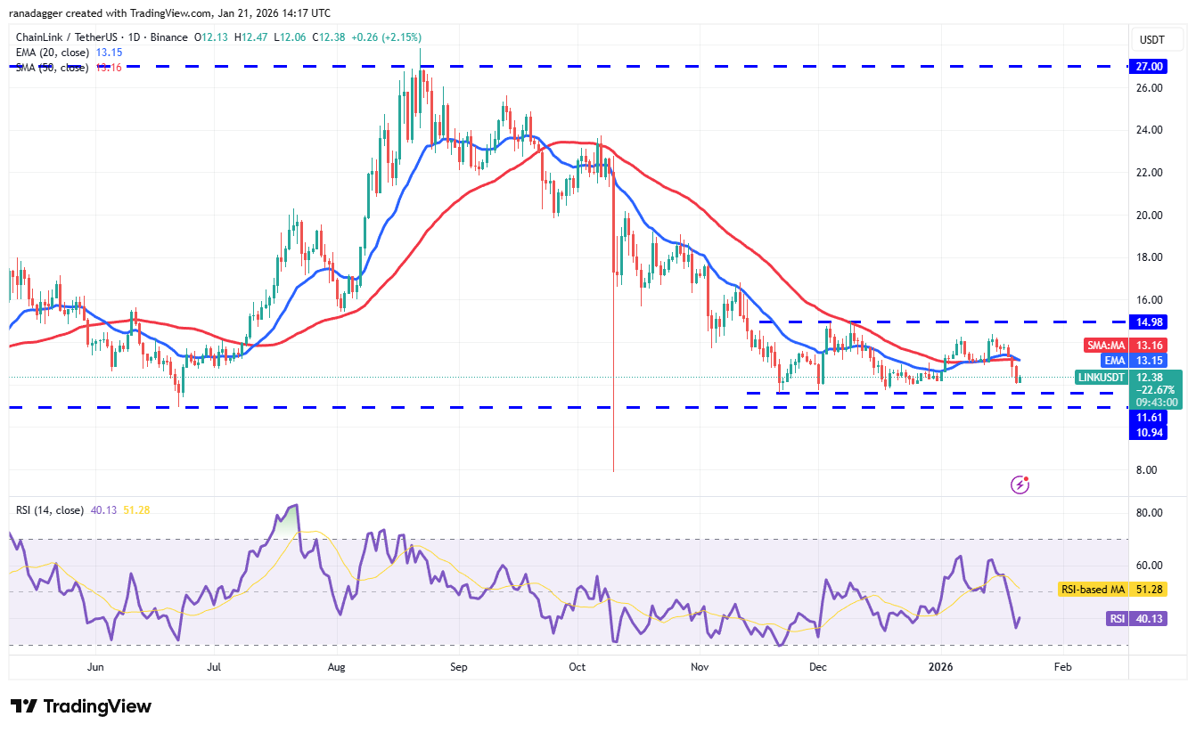 Las medias móviles planas y el RSI cerca del nivel 40 no dan una ventaja clara ni a los alcistas ni a los bajistas. Una ruptura por debajo de la zona de soporte de 11,61 dólares a 10,94 dólares inclinará la ventaja a favor de los bajistas. El par LINK/USDT podría entonces caer hacia el mínimo del 10 de octubre de 7,90 dólares.