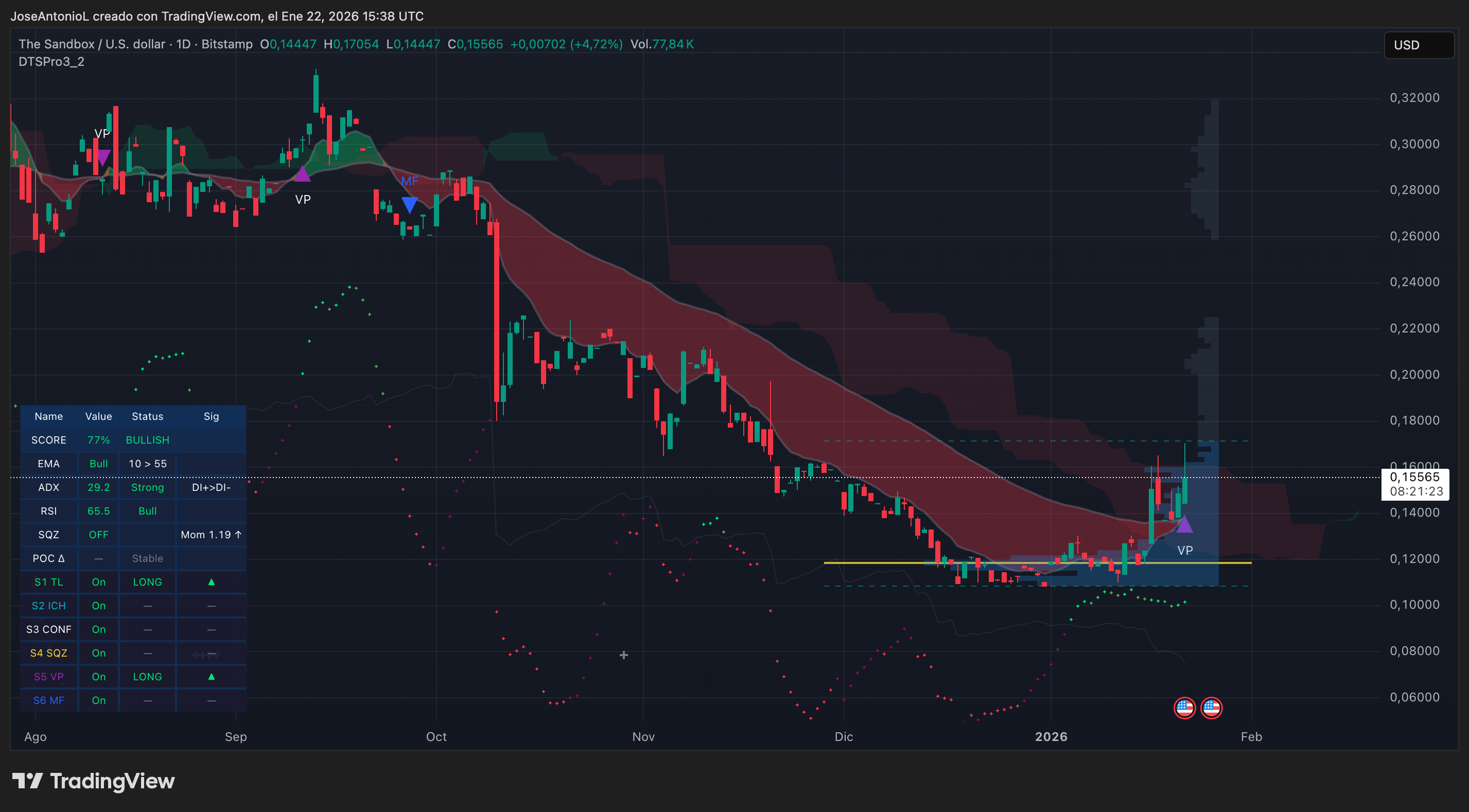 Mirando el gráfico diario, SAND muestra signos de querer salir del cruce de la muerte que mantiene desde octubre del año pasado. El precio abrió la sesión en $0.14447 y alcanzó un máximo intradiario de $0.17054, ganando 4.72% en el día. El volumen de negociación se disparó a 77.84K, validando el movimiento con participación real del mercado.