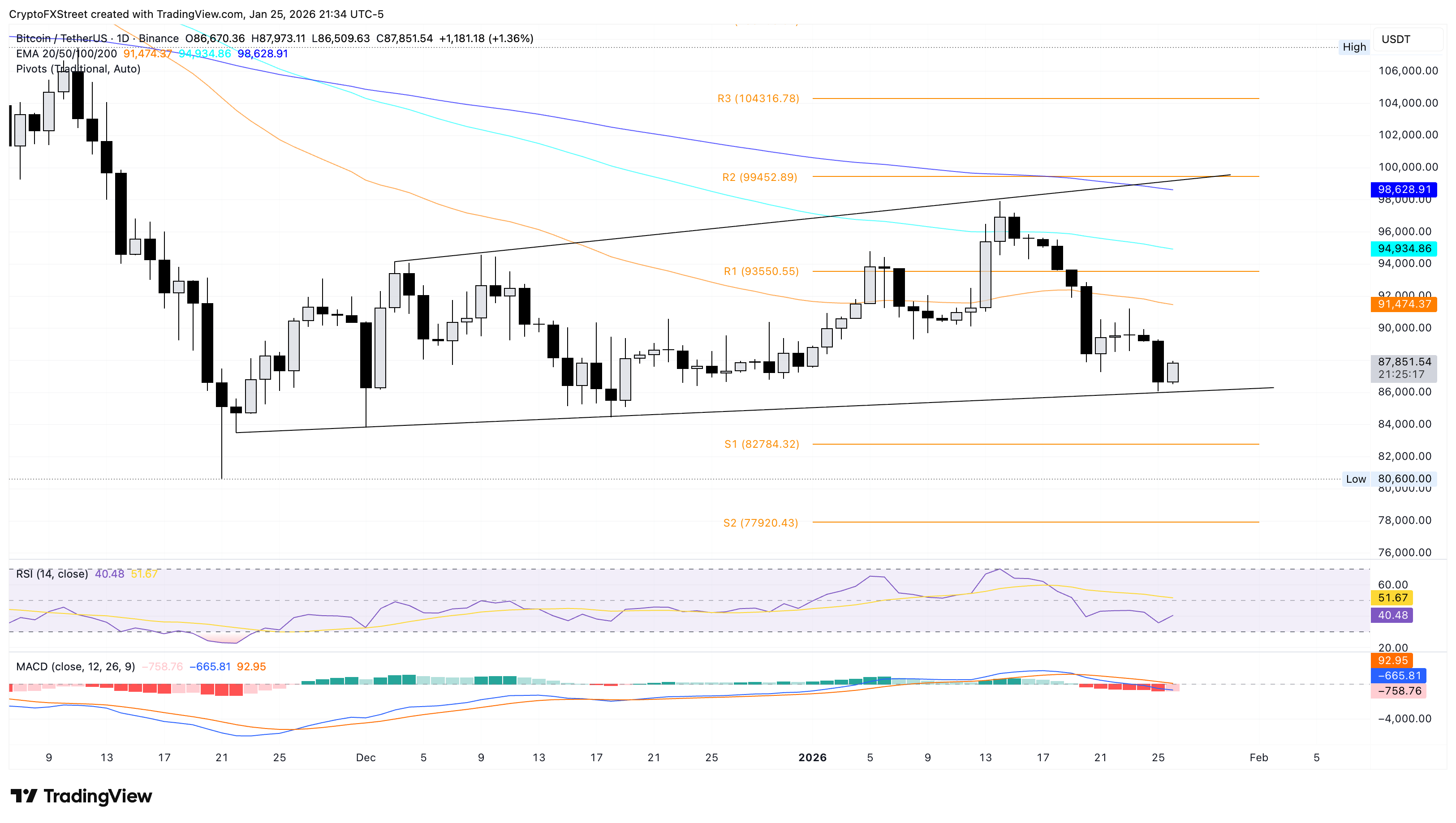 Bitcoin, por otro lado, cotiza cerca de 88.000$ en el momento de escribir estas líneas el lunes, recuperando más del 1% en el día tras una caída de casi el 3% el domingo. El rebote en BTC desde la línea de tendencia ascendente que conecta los mínimos del 22 de noviembre y del 18 de diciembre cerca de 83.500$ mantiene el canal expansivo más grande en el gráfico diario. BTC necesitaría un cierre por encima de 90.000$ para aliviar la presión de venta, con la media móvil exponencial (EMA) de 50 días en 91.474$ actuando como resistencia inicial.